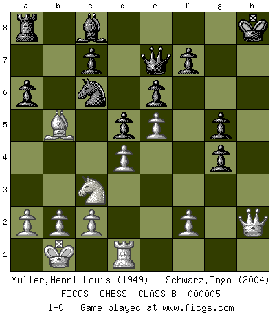 Last move : 1-0 2006 August 25 9:59:30 [Event "FICGS__CHESS__CLASS_B__000005"] [Site "FICGS"] [Date "2006.07.24"] [Round "1"] [White "Muller,Henri-Louis"] [Black "Schwarz,Ingo"] [Result "1-0"] [WhiteElo "1949"] [BlackElo "2004"] 1.e4 g6 2.d4 Bg7 3.Nc3 e6 4.Nf3 Ne7 5.Bf4 O-O 6.Qd2 d5 7.Bh6 Nbc6 8.Bxg7 Kxg7 9.e5 Nf5 10.h4 h5 11.O-O-O a6 12.Kb1 b5 13.Rg1 Nxh4 14.Nxh4 Qxh4 15.g4 hxg4 16.Qf4 Qe7 17.Rh1 Rh8 18.Rxh8 Kxh8 19.Bxb5 g5 20.Qh2+ 1-0 Robatsch defense Kingside Castling by player Black (move 5) Queenside Castling by player White (move 11) Player White won this chess game. Follow this game move after move (download)In Chess, just as in life, today's bliss may be tomorrow's poison. (Assaic) In der Schule lernt man nichts. Es ist nur Zeitverschwendung. (Robert James Fischer) Los libros de Ajedrez deben de usarse igual como usamos los anteojos: para mejorar la vista, aunque algunos jugadores los quieren usar como si ellos les otorgaran la vision. (José Raúl Capablanca) On n'a jamais que l'âge auquel on a commence à jouer aux échecs car après on cesse de vieillir. (Capablanca) Beep ! (R2D2 in Star Wars ep.3)