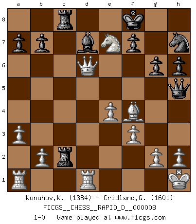 Last move : 1-0 2008 August 16 19:29:57 [Event "FICGS__CHESS__RAPID_D__000008"] [Site "FICGS"] [Date "2008.07.05"] [Round "1"] [White "Konuhov,Konstantin"] [Black "Cridland,Graham"] [Result "1-0"] [WhiteElo "1384"] [BlackElo "1601"] 1.e4 c5 2.Nc3 Nc6 3.Nf3 g6 4.d4 cxd4 5.Nxd4 Bg7 6.Be3 Nf6 7.Bc4 O-O 8.Bb3 d6 9.f3 Bd7 10.O-O Qa5 11.Nde2 Rac8 12.Qd2 Ne5 13.Kh1 Nc4 14.Bxc4 Rxc4 15.a3 Rfc8 16.Rfd1 Qh5 17.Bg5 h6 18.Be3 Nh7 19.Nd5 Kf8 20.Nxe7 Be5 21.Nf4 Bxf4 22.Bxf4 Rxc2 23.Qxd6 1-0 Sicilian : Closed, 2...Nc6 Kingside Castling by player Black (move 7) Kingside Castling by player White (move 10) Player White won this chess game. Follow this game move after move (download)When you are lonely, when you feel yourself an alien in the world, play Chess. This will raise your spirits and be your counselor in war. (Aristotle) Gegen einen Schachcomputer zu verlieren ist wie Löcher in den Strümpfen zuhaben. Es ist nicht peinlich, solange man der einzige ist der es weiß. (Anonymous) Aquel que teme a un Peón de Reina aislado, debería de retirarse del Ajedrez. (Siegbert Tarrasch) Mais n'est-ce pas déjà le limiter injurieusement que d'appeler les échecs un jeu? N'est-ce pas aussi une science, un art, ou quelque chose qui, comme le cercueil de Mahomet entre ciel et terre, est suspendu entre l'un et l'autre, et qui réunit un nombre incroyable de contraires ? (Stefan Zweig) Computers make it easier to do a lot of things, but most of the things they make it easier to do don't need to be done. (Andy Rooney)