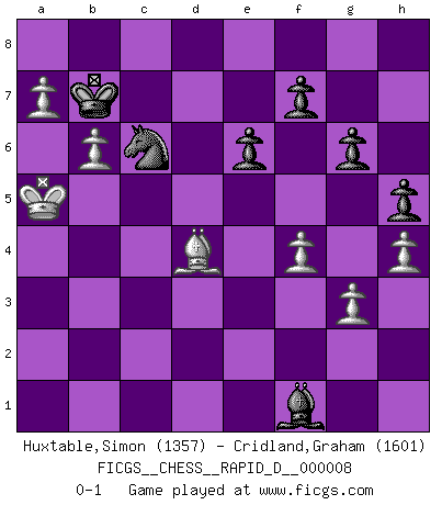 Last move : 0-1 2008 August 12 1:53:26 [Event "FICGS__CHESS__RAPID_D__000008"] [Site "FICGS"] [Date "2008.07.05"] [Round "1"] [White "Huxtable,Simon"] [Black "Cridland,Graham"] [Result "0-1"] [WhiteElo "1357"] [BlackElo "1601"] 1.d4 Nf6 2.c4 c6 3.Nc3 d5 4.Nf3 dxc4 5.a4 Na6 6.e4 Bg4 7.Bxc4 e6 8.Bxa6 bxa6 9.Qd3 a5 10.Ne5 Rc8 11.Qa6 Bh5 12.Qxa7 Bb4 13.Bd2 Bxc3 14.Bxc3 Nxe4 15.Bxa5 Qe7 16.Nxc6 Qf6 17.Rf1 O-O 18.Ne7+ Kh8 19.Nxc8 Rxc8 20.Qd7 Rg8 21.Rc1 Qf5 22.Rc8 Nf6 23.Rxg8+ Nxg8 24.Qb5 Qe4+ 25.Kd2 Qxd4+ 26.Kc1 Bg6 27.Bd2 Bd3 28.Qb4 Qxb4 29.Bxb4 Bxf1 30.g3 Nf6 31.Bc5 Nd7 32.Be3 Kg8 33.f4 Kf8 34.h4 Ke7 35.b4 Kd6 36.Kb2 Kc6 37.b5+ Kb7 38.Kb3 Be2 39.Kb4 Nb8 40.a5 Nd7 41.a6+ Kc7 42.a7 Kb7 43.b6 Bf3 44.Ka5 Nf6 45.Bd4 Nd5 46.Kb5 g6 47.Bf2 Nf6 48.Bd4 Nd7 49.Bf2 Be2+ 50.Ka5 h5 51.Bd4 Bf1 52.Bf2 Nf6 53.Bd4 Nd5 54.Bf2 Ne7 55.Bd4 Nc6+ 0-1 Queen's pawn game Kingside Castling by player Black (move 17) Player Black won this chess game. Follow this game move after move (download)In complicated positions, Bobby Fischer hardly had to be afraid of anybody. (Paul Keres) Je mehr ich von der FIDE weiss, um so weniger verstehe ich. (Alexander Kalifman) Los finales de Peón son del Ajedrez lo que el cesped es del Golf. (Cecil Purdy) Les écrivains ont utilisé les échecs pour analyser les côtés extrêmes de la nature humaine. Dans ce cadre, les échecs offrent un champ d'expérimentation idéal. Mais on pourrait faire la même chose avec la peinture. Et là, en vous référant à Van Gogh, vous ne tirerez pas de conclusion définitive sur les peintres. (Gary Kasparov) Life is like a play: it's not the length but the excellence of the acting that matters. (Seneca)