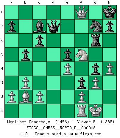 Last move : 1-0 2008 August 20 11:43:54 [Event "FICGS__CHESS__RAPID_D__000008"] [Site "FICGS"] [Date "2008.07.05"] [Round "1"] [White "Martinez Camacho,Victor Hugo"] [Black "Glover,Brian"] [Result "1-0"] [WhiteElo "1456"] [BlackElo "1388"] 1.e4 e5 2.Nf3 Nc6 3.Bb5 f5 4.Nc3 Nf6 5.Qe2 d6 6.d3 f4 7.h3 Be7 8.O-O O-O 9.b3 Be6 10.Bb2 Qc8 11.Ng5 Bd7 12.Bc4+ Kh8 13.Kh2 Nd4 14.Qd1 Ne6 15.Nxe6 Bxe6 16.Bxe6 Qxe6 17.Kh1 g5 18.d4 Rg8 19.dxe5 dxe5 20.Qe2 c6 21.Rad1 Rad8 22.Rd3 g4 23.Rxd8 Bxd8 24.Qc4 Qc8 25.Ne2 Bc7 26.h4 Qd7 27.Kg1 f3 28.Ng3 Rg6 29.Nf5 b5 30.Qb4 Nh5 31.g3 Ng7 32.Qf8+ 1-0 Ruy Lopez : Schliemann defense, Berger variation Kingside Castling by player White (move 8) Kingside Castling by player Black (move 8) Player White won this chess game. Follow this game move after move (download)In Fischer's hands, a slight theoretical advantage is as good a being a Queen ahead. (Isaac Kashdan) Kasparov stellt für gewöhnlich die Regeln auf und bricht sie dann selbst wieder. (Alexej Shirov) La captura del Rey enemigo es la finalidad pero no el primer objetivo de la partida. (William Steinitz) Le temps de noter son nom sur la feuille de partie, j'étais déjà en zeitnot ! D'un modeste amateur apparié lors de la première ronde d'un open contre le grand-maître Azmaïparashvili. There is a computer disease that anybody who works with computers knows about. It's a very serious disease and it interferes completely with the work. The trouble with computers is that you 'play' with them ! (Richard P. Feynman)