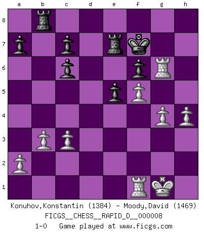 Last move : 1-0 2008 July 18 13:30:4 [Event "FICGS__CHESS__RAPID_D__000008"] [Site "FICGS"] [Date "2008.07.05"] [Round "1"] [White "Konuhov,Konstantin"] [Black "Moody,David"] [Result "1-0"] [WhiteElo "1384"] [BlackElo "1469"] 1.e4 e5 2.Nf3 Nc6 3.Bc4 Be7 4.d4 exd4 5.Nxd4 d6 6.O-O Nf6 7.Nxc6 bxc6 8.Nc3 O-O 9.f3 Be6 10.Bb3 Nd7 11.Be3 Ne5 12.Qe2 Bf6 13.f4 Ng4 14.Bxe6 Nxe3 15.Bxf7+ Rxf7 16.Qxe3 Rb8 17.b3 Re7 18.Rae1 Rb4 19.e5 dxe5 20.Ne4 Qd4 21.c3 Qxe3+ 22.Rxe3 Rb8 23.g4 Bh4 24.f5 h6 25.Rh3 Bf6 26.Nxf6+ gxf6 27.Rxh6 Kg7 28.Rg6+ Kf7 29.h4 1-0 Hungarian defense Kingside Castling by player White (move 6) Kingside Castling by player Black (move 8) Player White won this chess game. Follow this game move after move (download)By the beauty of his games, the clarity of his play, and the brilliance of his ideas, Fischer made himself an artist of the same stature as Brahms, Rembrandt, and Shakespeare. (David Levy) Mein Name ist Rustam Kamsky. Sie haben meinen Sohn belästigt. Bereiten Sie sich aufs Sterben vor. (Rustam Kamsky) A la fecha, Fischer esta simplemente un nivel arriba de todos los mejores jugadores de Ajedrez del mundo. (John Jacobs) À la honte des hommes, on sait que les lois du jeu sont les seules qui soient partout justes, claires, inviolables et exécutées. Pourquoi l'Indien qui a donné les règles du jeu d'échecs est-il obéi de bon gré dans toute la terre, et que les décrétales des papes, par exemple, sont aujourd'hui un objet d'horreur et de mépris ? C'est que l'inventeur des échecs combina tout avec justesse pour la satisfaction des joueurs, et que les papes, dans leurs décrétales, n'eurent en vue que leur seul avantage. L'Indien voulut exercer également l'esprit des hommes et leur donner du plaisir; les papes ont voulu abrutir l'esprit des hommes. Voltaire (Dictionnaire philosophique / Garnier 1967) 'preceded by its own quotation yields a falsehood' preceded by its own quotation yields a falsehood. (W. V. O. Quine - Set Theory And Its Logic, 1953)