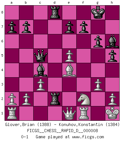 Last move : 0-1 2008 July 25 12:14:20 [Event "FICGS__CHESS__RAPID_D__000008"] [Site "FICGS"] [Date "2008.07.05"] [Round "1"] [White "Glover,Brian"] [Black "Konuhov,Konstantin"] [Result "0-1"] [WhiteElo "1388"] [BlackElo "1384"] 1.d4 Nf6 2.Nc3 d5 3.Nf3 g6 4.Bf4 Bg7 5.e3 O-O 6.g3 c6 7.Bg2 Nbd7 8.O-O h6 9.Be5 Nxe5 10.Nxe5 Bf5 11.f3 Nd7 12.f4 h5 13.e4 dxe4 14.Nxe4 Nxe5 15.fxe5 Bh6 16.c3 Qc8 17.Nf2 Rd8 18.Be4 Be6 19.Qc2 c5 20.dxc5 Rd2 21.Qb1 Qxc5 22.Qe1 Rad8 23.Kh1 Bc4 0-1 Queen's pawn game Kingside Castling by player Black (move 5) Kingside Castling by player White (move 8) Player Black won this chess game. Follow this game move after move (download)It is difficult to play against Einstein's theory --on his first loss to Fischer. (Mikhail Tal) Der Schachmeister von Heute braucht Courage, einen Killerinstinkt, Ausdauer und Arroganz. (Larry Evans) El Ajedrez es un terrible juego. Si no controlas el centro, tu oponente tiene una posición mas holgada. Si tienes control del centro, ¡entonces realmente tu tienes algo de que preocuparte!. (Siegbert Tarrasch) Ce n'est pas pour s'amuser qu'il joue aux échecs : il célèbre un culte. (Vladimir Nabokov) Wisdom doesn't necessarily come with age. Sometimes age just shows up all by itself. (Tom Watson)