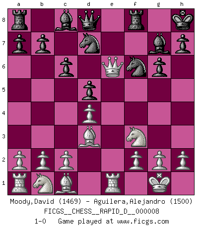 Last move : 1-0 2008 August 15 18:7:11 [Event "FICGS__CHESS__RAPID_D__000008"] [Site "FICGS"] [Date "2008.07.05"] [Round "1"] [White "Moody,David"] [Black "Aguilera,Alejandro"] [Result "1-0"] [WhiteElo "1469"] [BlackElo "1500"] 1.e4 e6 2.Bb5 g6 3.d4 Bg7 4.Nf3 c6 5.Bd3 d5 6.e5 f6 7.O-O Nd7 8.exf6 Ngxf6 9.Qe2 O-O 10.Qxe6+ Kh8 11.Re1 1-0 This chess game has been lost on time (started : 2008.07.05 6:14:17) French defense Kingside Castling by player White (move 7) Kingside Castling by player Black (move 9) Player White won this chess game. Follow this game move after move (download)He who takes the Queen's Knight's Pawn will sleep in the streets. (Anonymous) Ich könnte leicht behaupten: Ja,ja, Leonid Breschnew wollte nicht, daß ich Weltmeister werde. In der Tat war die Sache komplizierter. (Viktor Kortschnoi) Debemos de asegurarnos de que el Ajedrez no se convierta en un lenguaje muerto, muy interesante, pero tan solo para un grupo muy pequeño. (Sytze Faber) Il n'y a plus de joueurs du niveau de Jacob Murray dont la seule quête est le beau jeu, le plaisir de voir les pièces construire quelque chose. Sur 10 idées à la minute, 9 seront sans intérêt, la dernière s'avèrera géniale. (Christian Bauer) I've lost money so fast in these clubs it's left me reeling. I've read every poker book ever written, but the only way to get better at the game is to go out and play with people who are really good. The problem is, you stand to lose a lot of money doing it. (Matt Damon)