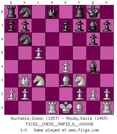Last move : 1-0 2008 July 15 4:46:33 [Event "FICGS__CHESS__RAPID_D__000008"] [Site "FICGS"] [Date "2008.07.05"] [Round "1"] [White "Huxtable,Simon"] [Black "Moody,David"] [Result "1-0"] [WhiteElo "1357"] [BlackElo "1469"] 1.d4 Nf6 2.c4 g6 3.Nc3 d5 4.Nf3 Bg7 5.Qb3 dxc4 6.Qxc4 O-O 7.e4 Bg4 8.Be3 Nfd7 9.Qb3 Nb6 10.Rd1 c5 11.dxc5 1-0 King's Indian defense, 3.Nc3 Kingside Castling by player Black (move 6) Player White won this chess game. Follow this game move after move (download)Chess is a part of culture and if a culture is declining then Chess too will decline. (Mikhail Botvinnik) Wenn Du nicht kämpfst, um anderen etwas zu beweisen, sondern nur für Dich selbst, dann bist du fast unbesiegbar. (Garry Kasparov) Para mi, el Ajedrez es la vida y cada partida es como una nueva vida. Todo jugador de Ajedrez suele vivir muchas vidas durante su vida. (Eduard Gufeld) La vie est comme un jeu d'échecs : nous esquissons un plan, mais celui-ci est tributaire de ce que daignent faire l'adversaire aux échecs et le destin dans la vie. (Arthur Schopenhauer) Locking firmely the window serves nothing, only small thiefs pass through there, the big thiefs enter through the front door. (Luc-Olivier Leclerc)