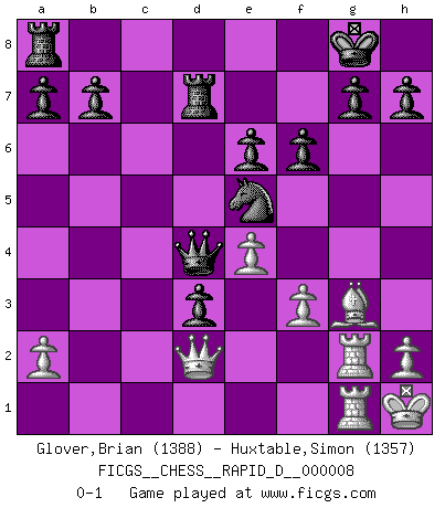 Last move : 0-1 2008 August 28 11:50:6 [Event "FICGS__CHESS__RAPID_D__000008"] [Site "FICGS"] [Date "2008.07.05"] [Round "1"] [White "Glover,Brian"] [Black "Huxtable,Simon"] [Result "0-1"] [WhiteElo "1388"] [BlackElo "1357"] 1.d4 d5 2.c4 c6 3.Nc3 Bf5 4.Nf3 Nf6 5.Bg5 Ne4 6.e3 Bg4 7.Bf4 e6 8.Be2 Bb4 9.Qc1 Qa5 10.O-O Bxc3 11.bxc3 dxc4 12.Bxc4 Bxf3 13.gxf3 Nxc3 14.Be5 Nd5 15.Kh1 O-O 16.Rg1 f6 17.Bg3 Re8 18.Bxd5 Qxd5 19.Qd1 Rd8 20.Qc2 Qxf3+ 21.Rg2 Rd7 22.Qb3 Qd5 23.Qd1 c5 24.f3 Nc6 25.Qe2 cxd4 26.Rag1 d3 27.e4 Qd4 28.Qd2 Ne5 0-1 QGD Slav defense Kingside Castling by player White (move 10) Kingside Castling by player Black (move 15) Player Black won this chess game. Follow this game move after move (download)I thought the most common mistake [in chess] was the first one: Learning the game :P (Garvin Gray, FICGS forum) Weshalb minderdergeübte Spieler mit g2-g4 beginnen? Die betreffenden sind unschlüssig, ob sie nun rechts (h4) oder links (f4) beginnen sollen, und in ihrer Ratlosigkeit entschliessen sie sich nach guter Bürgerart dazu, den goldenen Mittelweg zu wählen. (Aaron Nimzowitsch) El Ajedrez es sobre todo, ¡una pelea!. (Emanuel Lasker) Aidez vos pièces, elles vous aideront. (Paul Morphy) Whenever people agree with me, I always feel I must be wrong. (Oscar Wilde)