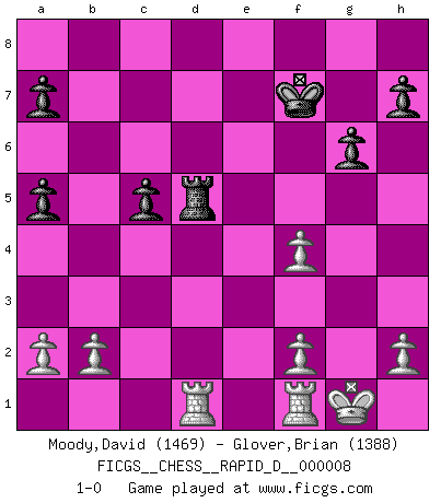 Last move : 1-0 2008 July 27 10:36:4 [Event "FICGS__CHESS__RAPID_D__000008"] [Site "FICGS"] [Date "2008.07.05"] [Round "1"] [White "Moody,David"] [Black "Glover,Brian"] [Result "1-0"] [WhiteElo "1469"] [BlackElo "1388"] 1.e4 e5 2.Nf3 Nc6 3.d4 exd4 4.Bc4 Be7 5.c3 d6 6.cxd4 Bd7 7.O-O Bg4 8.Qb3 Na5 9.Bxf7+ Kf8 10.Qa4 c5 11.Bxg8 Rxg8 12.d5 Bxf3 13.gxf3 b6 14.Nc3 Kf7 15.f4 Rf8 16.e5 g6 17.Qe4 Kg8 18.Nb5 Qd7 19.exd6 Bxd6 20.Qe6+ Rf7 21.Nxd6 Rd8 22.Qxf7+ Qxf7 23.Nxf7 Kxf7 24.Bd2 Rxd5 25.Bxa5 bxa5 26.Rad1 1-0 Scotch gambit : Benima defense Kingside Castling by player White (move 7) Player White won this chess game. Follow this game move after move (download)Many Chess players were surprised when after the game, Fischer quietly explained: 'I had already analyzed this possibility' in a position which I thought was not possible to foresee from the opening. (Mikhail Tal) Ein Isolani verdüstert die Stimmung auf dem ganzen Schachbrett. (Savielly Grigorievitsch Tartakower) El Ajedrez es 99 por ciento táctica. (Teichmann) Le jeu d'échecs est comme rejeté hors du temps. (Antoine de Saint-Exupéry) Creativity is allowing yourself to make mistakes. Art is knowing which ones to keep. (Scott Adams)