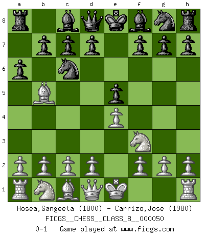 Last move : 0-1 2008 August 19 6:27:44 [Event "FICGS__CHESS__CLASS_B__000050"] [Site "FICGS"] [Date "2008.07.06"] [Round "1"] [White "Hosea,Sangeeta"] [Black "Carrizo,Jose"] [Result "0-1"] [WhiteElo "1800"] [BlackElo "1980"] 1.e4 e5 2.Nf3 Nc6 3.Bb5 a6 0-1 This chess game has been lost on time (started : 2008.07.06 20:18:12) Ruy Lopez (Spanish Opening) Player Black won this chess game. Follow this game move after move (download)Fischer is an American Chess tragedy on par with Morphy and Pillsbury. (Mig Greengard) Oft bringt ein stiller Zug das Erdbeben. (Richard Reti) Entre mas años cumplo, mas valoro los Peones. (Keres) Un journaliste : 'Vous préférez avoir une dame de plus sur l'échiquier ou au lit ?' Boris Spassky : 'Ca dépend de la position.' The age of a woman doesn't mean a thing. The best tunes are played on the oldest fiddles. (Ralph Waldo Emerson)