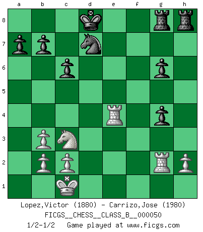 Last move : 1/2-1/2 2008 December 20 16:25:59 [Event "FICGS__CHESS__CLASS_B__000050"] [Site "FICGS"] [Date "2008.07.06"] [Round "1"] [White "Lopez,Victor"] [Black "Carrizo,Jose"] [Result "1/2-1/2"] [WhiteElo "1880"] [BlackElo "1980"] 1.e4 e5 2.Bc4 Nf6 3.d4 exd4 4.Nf3 Nxe4 5.Qxd4 Nf6 6.Bg5 Be7 7.Nc3 c6 8.O-O-O d5 9.Rhe1 Be6 10.Qh4 Nbd7 11.Bd3 Nc5 12.Nd4 Nfd7 13.Bxe7 Qxe7 14.Qxe7+ Kxe7 15.f4 g6 16.g4 h5 17.f5 hxg4 18.fxe6 fxe6 19.Rd2 e5 20.Nb3 Nxb3+ 21.axb3 Rag8 22.Rg2 e4 23.Bxe4 dxe4 24.Rxe4+ Kd8 1/2-1/2 Bishop's Opening : Urusov gambit Queenside Castling by player White (move 8) This chess game ended in a draw. Follow this game move after move (download)When your house is on fire, you can't be bothered with the neighbors. Or, as we say in Chess, if your King is under attack you don't worry about losing a Pawn on the Queen's side. (Gary Kasparov) Wer nie einen Fehler gemacht hat, hat nie etwas Neues ausprobiert. (Albert Einstein) Solo puedes ser bueno en el Ajedrez si amas al juego. (Bobby Fischer) Il n'y a pas de prix trop élevé au scalp de l'ennemi. (Koblentz) The Internet is the first thing that humanity has build that humanity doesn't understand, the largest experiment in anarchy that we have ever had. (Eric Schmidt)