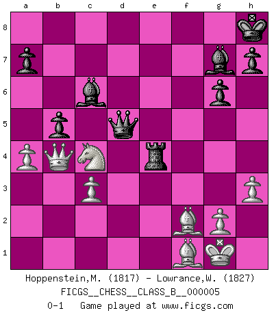 Last move : 0-1 2006 October 9 6:52:48 [Event "FICGS__CHESS__CLASS_B__000005"] [Site "FICGS"] [Date "2006.07.24"] [Round "1"] [White "Hoppenstein,Michael"] [Black "Lowrance,Wayne"] [Result "0-1"] [WhiteElo "1817"] [BlackElo "1827"] 1.d4 Nf6 2.Nf3 g6 3.e3 d5 4.Bd3 Bg7 5.Nbd2 O-O 6.O-O Nc6 7.c3 e5 8.Nxe5 Nxe5 9.dxe5 Ng4 10.f4 Nxe3 11.Qe2 Nxf1 12.Nxf1 Qe7 13.Ne3 c6 14.Bd2 f6 15.exf6 Qxf6 16.Rf1 Qd6 17.f5 Bd7 18.Rf3 Rae8 19.Qd1 c5 20.a4 c4 21.Bf1 Bc6 22.Qa1 d4 23.Nxc4 Qd7 24.Rf2 dxc3 25.bxc3 Rxf5 26.Be3 Rxf2 27.Bxf2 Re4 28.Qb1 Qd5 29.Ne3 Qd2 30.Qb3+ Kh8 31.Nc4 Qd5 32.h3 b6 33.Qb4 b5 0-1 King's Indian : East Indian defense Kingside Castling by player Black (move 5) Kingside Castling by player White (move 6) Player Black won this chess game. Follow this game move after move (download)I like the moment when I break a man's ego. (Bobby Fischer) Ich habe Putins Aufstieg an die Macht beobachtet und seine Politik, die demokratischen Institutionen meines Landes zu zerstören. (Garry Kasparov) Si pudieramos observar el interior de la cabeza de un jugador de Ajedrez, encontraríamos ahí un mundo lleno de sentimientos, imágenes, ideas, emoción y pasión. (Alfred Binet) On croit qu'il y a plus de mauvais joueurs que de bons joueurs, c'est faux : Il y a autant de joueurs qui gagnent que de joueurs qui perdent. (Philippe Geluck) When you stop learning you start dying. (Scott Adams)