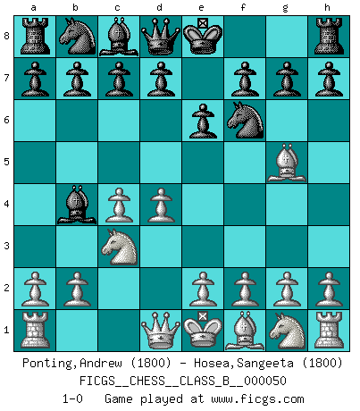 Last move : 1-0 2008 August 16 18:9:13 [Event "FICGS__CHESS__CLASS_B__000050"] [Site "FICGS"] [Date "2008.07.06"] [Round "1"] [White "Ponting,Andrew"] [Black "Hosea,Sangeeta"] [Result "1-0"] [WhiteElo "1800"] [BlackElo "1800"] 1.d4 Nf6 2.c4 e6 3.Nc3 Bb4 4.Bg5 1-0 This chess game has been lost on time (started : 2008.07.06 20:18:12) Nimzo-Indian : Leningrad variation Player White won this chess game. Follow this game move after move (download)The Pawns are the soul of the game. (Francois Andre Danican Philidor) Lisa Lane, amerikanische Schachmeisterin, hatte Fischer einmal als stärksten lebenden Spieler bezeichnet. Antwort: Das ist richtig, aber Lisa Lane ist eigentlich nicht in der Lage, das zu beurteilen. (Robert James Fischer) Repentinamente, me resultaba obvio en mi analisis que yo había pasado por alto lo que Fischer había visto en el tablero con la mas grande facilidad. (Mikhail Botvinnik) Un footballeur joue avec ses pieds, parfois avec sa tête. Un joueur d'échecs ne joue qu'avec sa tête. Et quand il ne joue plus, il meurt. (Jacob Murray) Over-the-board chess is the favorite of mortals, correspondence chess is the favorite of the gods. (Eduard Dyckhoff)