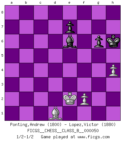 Last move : 1/2-1/2 2008 November 17 10:28:44 [Event "FICGS__CHESS__CLASS_B__000050"] [Site "FICGS"] [Date "2008.07.06"] [Round "1"] [White "Ponting,Andrew"] [Black "Lopez,Victor"] [Result "1/2-1/2"] [WhiteElo "1800"] [BlackElo "1880"] 1.d4 Nf6 2.c4 g6 3.Nc3 d5 4.Nf3 Bg7 5.Qb3 dxc4 6.Qxc4 O-O 7.e4 a6 8.e5 b5 9.Qb3 Nfd7 10.h4 c5 11.e6 c4 12.exf7+ Rxf7 13.Qd1 Nb6 14.h5 Nc6 15.hxg6 hxg6 16.Be3 Nd5 17.a4 Rb8 18.Be2 Nf4 19.Bxf4 Rxf4 20.axb5 axb5 21.Nxb5 Be6 22.Ra6 Rxb5 23.Rxc6 Qd5 24.Rxc4 Rxb2 25.Rc2 Qa5+ 26.Kf1 Rxc2 27.Qxc2 Qa1+ 28.Qd1 Bxd4 29.g3 Qxd1+ 30.Bxd1 Rg4 31.Nxd4 Rxd4 32.Ke2 Kg7 33.Rh4 Rxh4 34.gxh4 Kh6 1/2-1/2 King's Indian defense, 3.Nc3 Kingside Castling by player Black (move 6) 10 pieces endgame at move 31 : White KRBPP , Black KRBPP WHITE : King + 1 Rook 1 Bishop 2 Pawns BLACK : King + 1 Rook 1 Bishop 2 Pawns 9 pieces endgame at move 33 : White KBPP , Black KRBPP WHITE : King + 1 Bishop 2 Pawns BLACK : King + 1 Rook 1 Bishop 2 Pawns 8 pieces endgame at move 34 : White KBPP , Black KBPP WHITE : King + 1 Bishop 2 Pawns BLACK : King + 1 Bishop 2 Pawns This chess game ended in a draw. Follow this game move after move (download)If you aren't afraid of Spassky, then I have removed the element of money. (Jim Slater) Wie bekannt hörte Morphy 1859 auf, Schach zu spielen. Seine Enttäuschung galt nicht so sehr dem Schach, wie den Schachspielern. (Robert James Fischer) El Ajedrez no es como la vida... ¡tiene reglas!. (Mark Pasternak) Les échecs sont plus proches de l'art de l'assassinat que de l'art de la guerre. (Arturo Perez-Reverte) Dave, my mind is going. I can feel it. (HAL 9000 in 2001, a space odyssey)