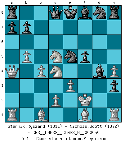 Last move : 0-1 2008 July 9 20:29:43 [Event "FICGS__CHESS__CLASS_B__000050"] [Site "FICGS"] [Date "2008.07.06"] [Round "1"] [White "Sternik,Ryszard"] [Black "Nichols,Scott"] [Result "0-1"] [WhiteElo "1811"] [BlackElo "1872"] 1.Nf3 d5 2.c4 d4 3.g3 c5 4.b4 cxb4 5.a3 f6 6.axb4 e5 7.b5 e4 8.Nh4 Nd7 9.f3 g5 10.Nf5 exf3 11.Nxd4 g4 12.Nc3 Ne5 13.e3 h5 14.h4 gxh3 15.Nd5 Bg4 16.Qa4 h4 17.gxh4 f2+ 18.Kxf2 f5 0-1 Reti : Advance variation Player Black won this chess game. Follow this game move after move (download)After black's reply to 1.e4 with 1..e5, leaves him always trying to get into the game. (Howard Staunton) Das typische an einem Großmeister ist, daß er eine gewonnene Position schnell und schmerzlos gewinnt. (Irving Chernev) ¿Que sería del Ajedrez sin errores graciosos?. (Kurt Richter) Nous sommes les pions de la mystérieuse partie d'Echecs jouée par Dieu. Il nous déplace, nous arrête, nous pousse encore, puis nous lance un à un dans la boîte du Néant. Epitaphe sur la tombe de David Janowsky (1868-1927). The bottom line is always the bottom line. (Johann Piek)