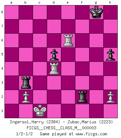 Last move : 1/2-1/2 2006 November 15 16:26:20 [Event "FICGS__CHESS__CLASS_M__000003"] [Site "FICGS"] [Date "2006.04.15"] [Round "1"] [White "Ingersol,Harry"] [Black "Zubac,Marius"] [Result "1/2-1/2"] [WhiteElo "2384"] [BlackElo "2223"] 1.e4 c5 2.Nf3 Nc6 3.d4 cxd4 4.Nxd4 Nf6 5.Nc3 e5 6.Ndb5 d6 7.Bg5 a6 8.Na3 b5 9.Bxf6 gxf6 10.Nd5 f5 11.g3 fxe4 12.Bg2 Bg7 13.Bxe4 Be6 14.Qh5 Rc8 15.O-O-O h6 16.Kb1 Ne7 17.c3 Rc5 18.Ne3 Qb6 19.Nac2 a5 20.Bf5 O-O 21.Bxe6 fxe6 22.Qh4 Rc7 23.f4 exf4 24.gxf4 Ng6 25.Qg4 Nxf4 26.Rhf1 h5 27.Qg3 Rcf7 28.Rfe1 d5 29.Ng2 Nxg2 30.Qxg2 b4 31.cxb4 axb4 32.Qh3 b3 33.axb3 Rf3 34.Qxe6+ Qxe6 35.Rxe6 Rxb3 36.Nd4 Bxd4 37.Rxd4 Rf2 38.Kc1 1/2-1/2 Sicilian : Pelikan (Lasker/Sveshnikov) variation Queenside Castling by player White (move 15) Kingside Castling by player Black (move 20) 10 pieces endgame at move 37 : White KRRPP , Black KRRPP WHITE : King + 2 Rooks 2 Pawns BLACK : King + 2 Rooks 2 Pawns This chess game ended in a draw. Follow this game move after move (download)Half the variations which are calculated in a tournament game turn out to be completely superfluous. Unfortunately, no one knows in advance which half. (Jan Tinman) Ein Schachgenie ist jemand der verdammt gut Schach spielt. (Jonathan Levitt) ¿Se han dado cuenta de que Fischer casi nunca ha tenido piezas malas? El las intercambia y las piezas malas se quedan con sus oponenets. (Yuri Balashov) Les échecs sont un jeu par leur forme, un art par leur essence et une science par sa difficulté d'acquisition. Ils peuvent vous procurer autant de plaisir qu'un bon livre ou une belle musique, mais vous n'aurez une réelle joie que si vous arrivez à bien jouer. (Tigran Petrosian) He is a liar. I just don't know what the lie is yet. (Horatio Caine, C.S.I. Miami)