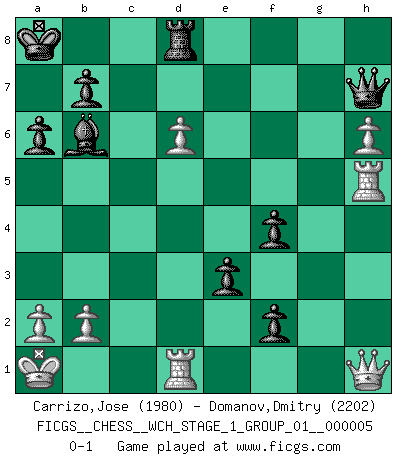 Last move : 0-1 2009 January 30 0:49:23 [Event "FICGS__CHESS__WCH_STAGE_1_GROUP_01__000005"] [Site "FICGS"] [Date "2008.07.08"] [Round "1"] [White "Carrizo,Jose"] [Black "Domanov,Dmitry"] [Result "0-1"] [WhiteElo "1980"] [BlackElo "2202"] 1.e4 c5 2.Nf3 d6 3.d4 cxd4 4.Nxd4 Nf6 5.Nc3 a6 6.Bg5 e6 7.f4 Qc7 8.Bxf6 gxf6 9.Qd2 Nc6 10.O-O-O Bd7 11.Kb1 O-O-O 12.Be2 h5 13.Nb3 Kb8 14.Qe3 Na5 15.Rd2 Nc4 16.Bxc4 Qxc4 17.Rhd1 h4 18.Qf2 Be7 19.Rd3 Rdg8 20.Nd2 Qc6 21.f5 Rc8 22.Nb3 Rcg8 23.Rh3 Qc8 24.Nd4 Rg4 25.Nf3 exf5 26.Nd5 Rxe4 27.Nd2 Re6 28.Rc3 Bc6 29.Nf3 Qe8 30.Nb4 d5 31.Nxd5 h3 32.gxh3 Bd6 33.h4 Be5 34.Rcd3 Rd6 35.c4 Bxd5 36.cxd5 Qd7 37.Qe1 Re8 38.Qb4 Ka8 39.h5 f4 40.h6 Rh8 41.h4 Rxh6 42.Qe4 Rh5 43.R3d2 Qb5 44.Rg2 Rd8 45.Rc2 Bd6 46.Rd3 Re8 47.Qd4 Rhe5 48.Nxe5 fxe5 49.Qe4 Qd7 50.h5 f5 51.Qh1 e4 52.Rh3 f3 53.h6 Qh7 54.Ka1 f4 55.R3h2 Bc7 56.Rc1 Bb6 57.d6 Rd8 58.Rd1 f2 59.Rh5 e3 0-1 Sicilian : Najdorf, 7.f4 Queenside Castling by player White (move 10) Queenside Castling by player Black (move 11) Player Black won this chess game. Follow this game move after move (download)Many have become Chess Masters, no one has become the Master of Chess. (Siegbert Tarrasch) Ohne Leiden bildet sich kein Charakter. (Ernst Freiherr von Feuchtersleben) La batalla por la última verdad nunca sera ganada. Y es por eso que el Ajedrez es tan fascinante. (Hans Kmoch) Des points faibles ou des trous dans la position de l'adversaire doivent être occupés par des pièces et non pas par des pions. (Siegbert Tarrasch) See no evil, hear no evil, speak no evil. (The 3 monkeys)