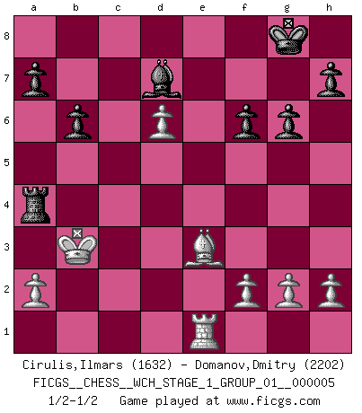 Last move : 1/2-1/2 2008 September 10 7:4:12 [Event "FICGS__CHESS__WCH_STAGE_1_GROUP_01__000005"] [Site "FICGS"] [Date "2008.07.08"] [Round "1"] [White "Cirulis,Ilmars"] [Black "Domanov,Dmitry"] [Result "1/2-1/2"] [WhiteElo "1632"] [BlackElo "2202"] 1.d4 Nf6 2.c4 g6 3.Nc3 d5 4.Nf3 Bg7 5.cxd5 Nxd5 6.e4 Nxc3 7.bxc3 c5 8.Be3 Qa5 9.Qd2 Nc6 10.Rc1 cxd4 11.cxd4 Qxd2+ 12.Kxd2 O-O 13.d5 Rd8 14.Ke1 Na5 15.Bg5 Bd7 16.Bxe7 Rac8 17.Kd2 Rxc1 18.Kxc1 Re8 19.Bb4 Nc4 20.Bxc4 Rxe4 21.Nd2 Bh6 22.Kb2 Bxd2 23.Bxd2 Rxc4 24.Be3 b6 25.Re1 f6 26.Kb3 Ra4 27.d6 1/2-1/2 King's Indian defense, 3.Nc3 Kingside Castling by player Black (move 12) This chess game ended in a draw. Follow this game move after move (download)Modern Chess is too much concerned with things like Pawn structure. Forget it, Checkmate ends the game. (Nigel Short) Wenn Schach ein enormer Dschungel ist, der seine Myriaden von Geheimnissen nicht preisgeben will, dann sind Computer die Kettensägen einer gewaltigen ökologisch unsensiblen Nutzholzfirma. (Nigel Short) Los Peones son nacidos libres, y aún así, se encuentran encadenados por todos lados. (Rick Kennedy) Donnez-moi un Cavalier en 6e et je gagnerais toutes mes parties. (Steinitz) Nobody is always a winner, and anybody who says he is, is either a liar or doesn't play poker. (Amarillo Slim)