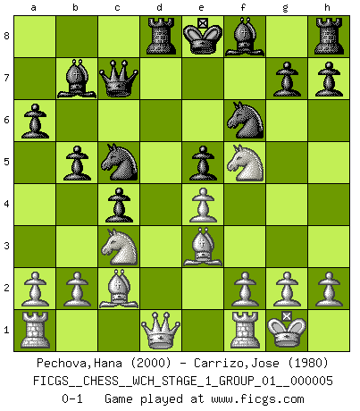 Last move : 0-1 2008 October 22 12:32:40 [Event "FICGS__CHESS__WCH_STAGE_1_GROUP_01__000005"] [Site "FICGS"] [Date "2008.07.08"] [Round "1"] [White "Pechova,Hana"] [Black "Carrizo,Jose"] [Result "0-1"] [WhiteElo "2000"] [BlackElo "1980"] 1.d4 d5 2.c4 e6 3.Nc3 c6 4.e3 Nf6 5.Nf3 Nbd7 6.Bd3 dxc4 7.Bxc4 b5 8.Bd3 Bb7 9.O-O a6 10.e4 c5 11.d5 Qc7 12.dxe6 fxe6 13.Bc2 c4 14.Nd4 Nc5 15.Be3 e5 16.Nf5 Rd8 0-1 This chess game has been lost on time (started : 2008.07.08 16:10:42) QGD : Semi-Slav Kingside Castling by player White (move 9) Player Black won this chess game. Follow this game move after move (download)Could we look into the head of a Chess player, we should see there a whole world of feelings, images, ideas, emotion and passion. (Alfred Binet) Kleine Schachspieler machen Mist, und große Schachspieler machen Mist, aber große machen weniger Mist. (Fritz Sämisch) El Ajedrez es 99 por ciento táctica. (Teichmann) Botvinnik disait en comparant les échecs à la musique: Il existe une science dont le but est l'étude de l'acoustique et des sons. Mais il y a aussi un art qui se sert de l'océan des sons : c'est la musique. De toute évidence, il en est de même pour la pensée. La logique est l'étude des lois de la réflexion et les échecs reflètent, en tant qu'art, le côté logique de la réflexion, sous la forme d'images artistiques... Extrait de Fischer - Spassky, Reykjavik 1972 par Alexander & F. Wyndham (Ed. Solar), p 37. Quotation,n.: The act of repeating erroneously the words of another. The words erroneously repeated. (Ambrose Bierce, The Devil's Dictionary)