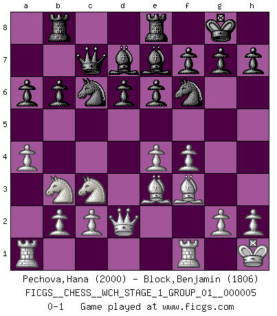 Last move : 0-1 2008 October 15 23:32:35 [Event "FICGS__CHESS__WCH_STAGE_1_GROUP_01__000005"] [Site "FICGS"] [Date "2008.07.08"] [Round "1"] [White "Pechova,Hana"] [Black "Block,Benjamin"] [Result "0-1"] [WhiteElo "2000"] [BlackElo "1806"] 1.e4 c5 2.Nf3 e6 3.d4 cxd4 4.Nxd4 Nf6 5.Nc3 d6 6.Be2 Be7 7.O-O O-O 8.f4 Nc6 9.Be3 a6 10.a4 Qc7 11.Kh1 Re8 12.Bf3 Rb8 13.Qd2 Bd7 14.Nb3 b6 0-1 This chess game has been lost on time (started : 2008.07.08 16:10:42) Sicilian : Anderssen variation Kingside Castling by player White (move 7) Kingside Castling by player Black (move 7) Player Black won this chess game. Follow this game move after move (download)Fischer, who may or may not be mad as a hatter, has every right to be horrified. (Jeremy Silman) Darum geht es im Schach. Einen Tag gibst du deinem Gegner eine Lektion, am nächsten Tag gibt er dir eine. (Robert James Fischer) El juego de Fischer siempre fue nítido, racional y brillante. Uno de los mejores por siempre. (Dave Regis) Nous sommes les pions de la mystérieuse partie d'Echecs jouée par Dieu. Il nous déplace, nous arrête, nous pousse encore, puis nous lance un à un dans la boîte du Néant. Epitaphe sur la tombe de David Janowsky (1868-1927). Computers have lots of memory but no imagination. (Anonymous)