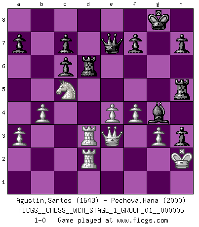 Last move : 1-0 2008 October 10 10:39:44 [Event "FICGS__CHESS__WCH_STAGE_1_GROUP_01__000005"] [Site "FICGS"] [Date "2008.07.08"] [Round "1"] [White "Agustin,Santos"] [Black "Pechova,Hana"] [Result "1-0"] [WhiteElo "1643"] [BlackElo "2000"] 1.d4 Nf6 2.Nf3 g6 3.c4 Bg7 4.Nc3 d5 5.cxd5 Nxd5 6.Bd2 O-O 7.Rc1 Nb6 8.e3 Nc6 9.Bb5 e5 10.Bxc6 bxc6 11.dxe5 Nc4 12.Na4 Nxe5 13.Nxe5 Bxe5 14.Bc3 Qg5 15.O-O Rd8 16.Qf3 Rd6 17.h3 Bxc3 18.Rxc3 Rb8 19.Nc5 Qe7 20.Rc2 Rb4 21.a3 Rh4 22.b4 g5 23.Rc3 Rg6 24.Rd1 Kg7 25.e4 g4 26.Qe3 gxh3 27.g3 Rh5 28.Kh2 Rd6 29.Rcd3 Kg8 30.f4 Bg4 31.R1d2 1-0 King's Indian : East Indian defense Kingside Castling by player Black (move 6) Kingside Castling by player White (move 15) Player White won this chess game. Follow this game move after move (download)Good positions don't win games, good moves do. (Gerald Abrahams) Modernes Schach erfordert enorme Anspannung. Es ist für einen normalen Menschen unmöglich das auszuhalten. (Viktor Kortschnoi) Cuando le juegas a Fischer, no es una cuestion de si vas a ganar o perder. Es una cuestion de si vas a sobrevivir. (Boris Spassky) En blitz, le Cavalier l'emporte sur le Fou. (Vlastimil Hort) Do not put your faith in what statistics say until you have carefully considered what they do not say. (William W. Watt)