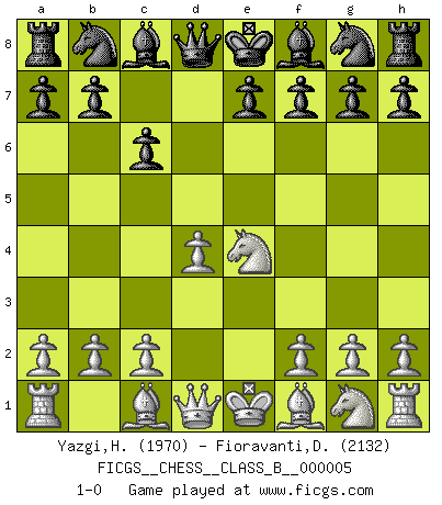 Last move : 1-0 2006 August 15 19:19:26 [Event "FICGS__CHESS__CLASS_B__000005"] [Site "FICGS"] [Date "2006.07.24"] [Round "1"] [White "Yazgi,Huseyin Yigit"] [Black "Fioravanti,Diego"] [Result "1-0"] [WhiteElo "1970"] [BlackElo "2132"] 1.e4 c6 2.d4 d5 3.Nd2 dxe4 4.Nxe4 1-0 Caro-Kann : 3.Nd2 Player White won this chess game. Follow this game move after move (download)We must make sure that Chess will not be like a dead language, very interesting, but for a very small group. (Sytze Faber) Früher wurde jeder komplizierte Zug, jedes interessante Opfer mit großem Beifall und Enthusiasmus aufgenommen. Heute schaltet man einfach seinen Fritz an, und man kann sehen, was los ist, ob der Zug geht oder nicht. (Vladimir Kramnik) Bobby Fischer es el mas grande genio de Ajedrez de todos los tiempos. (Alexander Kotov) Les Echecs mettent en conflit, non pas deux intelligences, mais deux volontés. (Lasker) The leaves of memory seemed to make a mournful rustling in the dark. (Henry Wadsworth Longfellow)