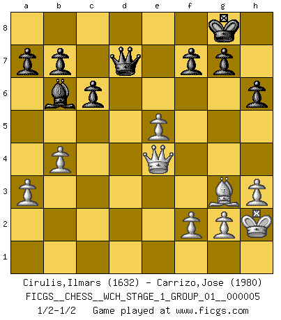 Last move : 1/2-1/2 2008 October 25 21:30:43 [Event "FICGS__CHESS__WCH_STAGE_1_GROUP_01__000005"] [Site "FICGS"] [Date "2008.07.08"] [Round "1"] [White "Cirulis,Ilmars"] [Black "Carrizo,Jose"] [Result "1/2-1/2"] [WhiteElo "1632"] [BlackElo "1980"] 1.d4 d5 2.c4 e6 3.Nc3 c6 4.e3 Nf6 5.Nf3 Nbd7 6.Bd2 Bd6 7.Bd3 O-O 8.O-O dxc4 9.Bxc4 e5 10.Qc2 exd4 11.exd4 Nb6 12.Bd3 h6 13.Ne5 Be6 14.Rfe1 Re8 15.a3 Bc7 16.Ne2 Ng4 17.Bf4 Nxe5 18.dxe5 Nd5 19.Bg3 Ba5 20.Red1 Qg5 21.Be4 Rad8 22.Nd4 Bg4 23.Nf3 Bxf3 24.Bxf3 Nf4 25.Qe4 Nh5 26.Rxd8 Bxd8 27.Bxh5 Qxh5 28.Re1 Bb6 29.b4 Qg5 30.Rd1 Rd8 31.Rxd8+ Qxd8 32.h3 Qd7 33.Kh2 1/2-1/2 QGD : Semi-Slav Kingside Castling by player Black (move 7) Kingside Castling by player White (move 8) This chess game ended in a draw. Follow this game move after move (download)Before the endgame, the Gods have placed the middle game. (Siegbert Tarrasch) Bobby Fischer ist kein Vorbild für die heutige Jugend. (Viktor Kortschnoi) El Ajedrez demanda una total concentración. (Bobby Fischer) Dieu déplace le joueur, et celui-ci la pièce. Quel Dieu derrière Dieu commence donc la trame ? Arturo Perez-Reverte (prix de littérature policière 1993). I can't decide which is riskier; taking crazy risks, or taking advice on crazy risks from a crazy risk taker. (Gregory House in House M.D.)
