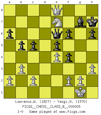 Last move : 1-0 2006 December 13 12:57:9 [Event "FICGS__CHESS__CLASS_B__000005"] [Site "FICGS"] [Date "2006.07.24"] [Round "1"] [White "Lowrance,Wayne"] [Black "Yazgi,Huseyin Yigit"] [Result "1-0"] [WhiteElo "1827"] [BlackElo "1970"] 1.e4 e5 2.Nf3 Nc6 3.Bb5 Nge7 4.O-O g6 5.Nc3 Bg7 6.d3 O-O 7.Bg5 h6 8.Bh4 d6 9.h3 a6 10.Ba4 b5 11.Bb3 Be6 12.Qd2 g5 13.Bg3 Ng6 14.Nd5 Nf4 15.Rfe1 Ne7 16.d4 c6 17.Nxe7+ Qxe7 18.Bxf4 gxf4 19.dxe5 dxe5 20.Bxe6 Qxe6 21.Nh4 Rfd8 22.Qe2 Rd7 23.Red1 Rad8 24.b3 Kh7 25.Nf5 Bf8 26.Rxd7 Rxd7 27.Rd1 Rxd1+ 28.Qxd1 c5 29.Qd8 Bg7 30.Ne7 f6 31.Qe8 1-0 Ruy Lopez : Cozio defense Kingside Castling by player White (move 4) Kingside Castling by player Black (move 6) Player White won this chess game. Follow this game move after move (download)You cannot play at Chess if you are kind-hearted. (French Proverb) Computer sind die einzigen Gegner, die nicht immer eine Ausrede auf Lager haben, wenn sie gegen mich verlieren. (Robert James Fischer) El Ajedrez lo es todo: arte, ciencia y deporte. (Anatoly Karpov) Les échecs sont un jeu terrible. Si vous n'avez pas le centre, votre adversaire a une position plus libre. Par contre, si vous avez le centre, alors vous avez vraiment quelque chose pour laquelle vous inquiéter ! (Siegbert Tarrasch) All the troubles of the world come from being unable to sit alone in a quiet room. (Blaise Pascal)