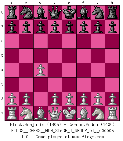 Last move : 1-0 2008 August 8 17:23:31 [Event "FICGS__CHESS__WCH_STAGE_1_GROUP_01__000005"] [Site "FICGS"] [Date "2008.07.08"] [Round "1"] [White "Block,Benjamin"] [Black "Carras,Pedro"] [Result "1-0"] [WhiteElo "1806"] [BlackElo "1400"] 1.c4 1-0 This chess game has been lost on time (started : 2008.07.08 16:10:42) English Opening Player White won this chess game. Follow this game move after move (download)Later, I began to succeed in decisive games. Perhaps because I realized a very simple truth: not only was I worried, but also my opponent. (Mikhail Tal) Die Arbeit ist etwas Unnatürliches. Die Faulheit allein ist göttlich. (Anatole France) Los Peones son nacidos libres, y aún así, se encuentran por doquier encadenados. (Rick Kennedy) Même si l'adversaire joue le coup analysé précédemment, recommencez l'analyse en voyant la nouvelle position. Première règle de Blumenfeld Sometimes it pays to stay in bed in Monday, rather than spending the rest of the week debugging Monday's code. (Dan Salomon)