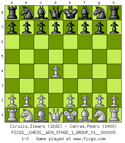 Last move : 1-0 2008 August 7 17:16:17 [Event "FICGS__CHESS__WCH_STAGE_1_GROUP_01__000005"] [Site "FICGS"] [Date "2008.07.08"] [Round "1"] [White "Cirulis,Ilmars"] [Black "Carras,Pedro"] [Result "1-0"] [WhiteElo "1632"] [BlackElo "1400"] 1.d4 1-0 This chess game has been lost on time (started : 2008.07.08 16:10:42) Queen's pawn Player White won this chess game. Follow this game move after move (download)I have added these principles to the law: get the Knights into action before both Bishops are developed. (Emanuel Lasker) Man braucht nicht immer den besten Zug zu spielen: Ein Zug muß aktiv, unternehmungslustig, korrekt und schön sein. (David Bronstein) Robert Fischer es la ley hacia si mismo. (Larry Evans) Aux échecs, l'amour-propre est satisfait quand on remporte la victoire, mais il n'y a pas de honte à être battu. (Benjamin Franklin) There is far too much law for those who can afford it and far too little for those who cannot. (Derek Bok)