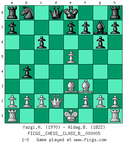 Last move : 1-0 2006 November 15 23:15:40 [Event "FICGS__CHESS__CLASS_B__000005"] [Site "FICGS"] [Date "2006.07.24"] [Round "1"] [White "Yazgi,Huseyin Yigit"] [Black "Aldag,Benjamin"] [Result "1-0"] [WhiteElo "1970"] [BlackElo "1822"] 1.d4 g6 2.e4 Bg7 3.Nc3 d6 4.Be3 Nf6 5.Nf3 c6 6.Qd2 b5 7.Bd3 Bg4 8.e5 b4 9.Ne4 Nxe4 10.Bxe4 Bxf3 11.Bxf3 dxe5 12.dxe5 1-0 Modern defense Player White won this chess game. Follow this game move after move (download)Look at Garry Kasparov. After he loses, invariably he wins the next game. He just kills the next guy. That's something that we have to learn to be able to do. (Maurice Ashley) Deine Wertungszahl - vorausgesetzt einige Jahre schachliche Anstrengung - entspricht etwa dem zehnfachen Deines IQ plus 1000. (Jonathan Levitt) Siempre es mejor sacrificar los hombres de tu oponente. (Savielly Tartakower) Le plus grand jeu de l'esprit jamais inventé, plus vous l'apprenez, plus vous y prenez du plaisir. (Garry Kasparov) Rules and bones are meant to be broken. (Anonymous)