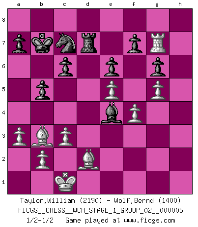 Last move : 1/2-1/2 2008 October 11 10:51:3 [Event "FICGS__CHESS__WCH_STAGE_1_GROUP_02__000005"] [Site "FICGS"] [Date "2008.07.08"] [Round "1"] [White "Taylor,William"] [Black "Wolf,Bernd"] [Result "1/2-1/2"] [WhiteElo "2190"] [BlackElo "1400"] 1.e4 d5 2.exd5 Qxd5 3.Nc3 Qa5 4.d4 Nf6 5.Nf3 c6 6.Bc4 Bf5 7.Bd2 e6 8.Qe2 Bb4 9.O-O-O Nbd7 10.a3 Bxc3 11.Bxc3 Qc7 12.Ne5 Nxe5 13.dxe5 Nd5 14.Bd2 O-O-O 15.g4 Bg6 16.f4 h5 17.h3 Qb6 18.Bb3 hxg4 19.hxg4 Rxh1 20.Rxh1 Qd4 21.Rf1 Be4 22.Re1 Bg6 23.c3 Qd3 24.Qxd3 Bxd3 25.Rh1 b5 26.Rh3 Be4 27.Rh5 Rd7 28.Rh8+ Kb7 29.Rg8 g6 30.Rg7 Nc7 31.g5 1/2-1/2 Scandinavian (centre counter) defense Queenside Castling by player White (move 9) Queenside Castling by player Black (move 14) This chess game ended in a draw. Follow this game move after move (download)Best by test: 1. e4 (Bobby Fischer) Was ist der Unterschied zwischen einem Strassenarbeiter und einem Schachspieler? --Der Schachspieler bewegt sich ab und zu. (Anonymous) Botvinnik trató de alejar el misterio referente al Ajedrez, siempre relacionandolo a situaciones de la vida diaria. Solía llamar al Ajedrez un problema inexacto típico, similar a aquellos en que la gente tiene siempre que resolver a cada día. (Garry Kasparov) Les Echecs sont et restent toujours un combat, un combat intégral comme la boxe, la lutte ou un autre sport, et où il doit y avoir un vainqueur et un vaincu. (Joseph Emil Diemer) The production of too many useful things results in too many useless people. (Karl Marx)