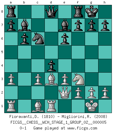 Last move : 0-1 2008 September 14 11:46:7 [Event "FICGS__CHESS__WCH_STAGE_1_GROUP_02__000005"] [Site "FICGS"] [Date "2008.07.08"] [Round "1"] [White "Fioravanti,Diego"] [Black "Migliorini,Roberto"] [Result "0-1"] [WhiteElo "1810"] [BlackElo "2008"] 1.Nf3 Nf6 2.d4 e6 3.c4 b6 4.a3 Bb7 5.Nc3 d5 6.cxd5 Nxd5 7.e3 Be7 8.Bd3 Nxc3 9.bxc3 c5 10.O-O Nc6 11.Qe2 O-O 12.Rd1 cxd4 0-1 Reti Opening Kingside Castling by player White (move 10) Kingside Castling by player Black (move 11) Player Black won this chess game. Follow this game move after move (download)Bobby Fischer is the greatest Chess genius of all time ! (Alexander Kotov) Die Partien sind immer verschieden, die Interviews immer die gleichen. (Garry Kasparov) Me siento como si fuera una pieza en una partida de Ajedrez, cuando mi oponente me indica: esa pieza no puede ser movida. (Soren Kierkegaard) Le génie consiste à savoir transgresser les règles au moment opportun. (Teichmann) The arrogant army will lose certainly the battle. (Chinese proverb)