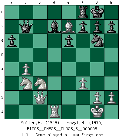 Last move : 1-0 2006 December 13 12:50:52 [Event "FICGS__CHESS__CLASS_B__000005"] [Site "FICGS"] [Date "2006.07.24"] [Round "1"] [White "Muller,Henri-Louis"] [Black "Yazgi,Huseyin Yigit"] [Result "1-0"] [WhiteElo "1949"] [BlackElo "1970"] 1.e4 c5 2.Nf3 e6 3.d4 cxd4 4.Nxd4 a6 5.Nc3 b5 6.Bd3 Bb7 7.O-O d6 8.a4 b4 9.Na2 Nf6 10.Re1 d5 11.e5 Ne4 12.f3 Qb6 13.Be3 Nc5 14.Bf1 Nxa4 15.c3 Nxb2 16.Qb3 Nc4 17.Bxc4 dxc4 18.Qxc4 Nd7 19.cxb4 Nxe5 20.Qe2 Ng6 21.Rac1 Rc8 22.Nb3 Qb5 23.Rxc8+ Bxc8 24.Qc2 Bd7 25.Rd1 Be7 26.Bc5 O-O 27.Nc3 Qb7 28.Bxe7 1-0 Sicilian : Kan, 5.Nc3 Kingside Castling by player White (move 7) Kingside Castling by player Black (move 26) Player White won this chess game. Follow this game move after move (download)Bobby Fischer's current state of mind is indeed a tragedy. One of the world's greatest Chess players - the pride and sorrow of American Chess. (Frank Brady) Man gibt nur Pakete auf. (Paul Keres) Durante una competencia de Ajedrez, un Maestro de Ajedrez deberá ser una combinación de presa de caza y un Monge. (Alexander Alekhine) Si je n'étais pas joueur d'échecs, je serais le meilleur dans quelque chose d'autre. (Anatoli Karpov) The message for business people contemplating their place in the cyberspace is simple and direct: get linked or get lost. (Vic Sussman and Kenan Pollack)