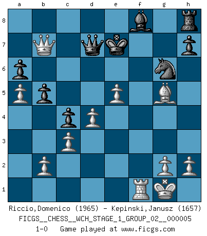 Last move : 1-0 2008 August 27 12:35:36 [Event "FICGS__CHESS__WCH_STAGE_1_GROUP_02__000005"] [Site "FICGS"] [Date "2008.07.08"] [Round "1"] [White "Riccio,Domenico"] [Black "Kepinski,Janusz"] [Result "1-0"] [WhiteElo "1965"] [BlackElo "1657"] 1.e4 e6 2.d4 d5 3.Nc3 Nf6 4.e5 Ne4 5.Nxe4 dxe4 6.Bc4 a6 7.a4 b6 8.Ne2 Bb7 9.Nf4 Nc6 10.c3 Ne7 11.O-O Ng6 12.Nh5 Bd5 13.Qe2 Qc8 14.a5 Qb7 15.Bxd5 exd5 16.f3 b5 17.fxe4 dxe4 18.Qg4 c5 19.Be3 Qd5 20.Rad1 c4 21.Rf2 Rd8 22.Rdf1 Qe6 23.Qxe4 f6 24.Rxf6 gxf6 25.Nxf6+ Ke7 26.Qb7+ Rd7 27.Nxd7 Qxd7 28.Bg5+ 1-0 French : Steinitz variation Kingside Castling by player White (move 11) Player White won this chess game. Follow this game move after move (download)The hardest game to win is a won game. (Emanuel Lasker) In Buenos Aires ist es nicht mein vorrangiges Ziel ein starkes Turnier zu organisieren, sondern ein Turnier für Gentlemen. Ich würde nie Kamsky einladen. Ich mag keine Probleme. (Miguel Najdorf) Una victoria por una combinación errónea, aunque sea espectacular, me llena de horror artístico. (Wilhelm Steinitz) Les échecs sont un jeu terrible. Si vous n'avez pas le centre, votre adversaire a une position plus libre. Par contre, si vous avez le centre, alors vous avez vraiment quelque chose pour laquelle vous inquiéter ! (Siegbert Tarrasch) Yoga is 99% practice and 1% knowledge. (Sri Krishna Pattabhi Jois)
