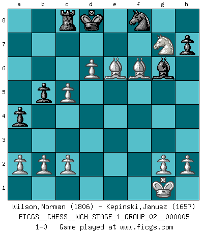 Last move : 1-0 2008 September 5 19:41:47 [Event "FICGS__CHESS__WCH_STAGE_1_GROUP_02__000005"] [Site "FICGS"] [Date "2008.07.08"] [Round "1"] [White "Wilson,Norman"] [Black "Kepinski,Janusz"] [Result "1-0"] [WhiteElo "1806"] [BlackElo "1657"] 1.e4 e6 2.d4 d5 3.Nc3 Nf6 4.e5 Ne4 5.Nxe4 dxe4 6.Be3 c5 7.dxc5 Qxd1+ 8.Rxd1 Nd7 9.Bb5 a6 10.Ba4 Be7 11.Nh3 f5 12.Nf4 Bg5 13.Rd6 Be7 14.Nxe6 f4 15.Bd4 b5 16.Bb3 Rb8 17.Nxg7+ Kf8 18.Ne6+ Kf7 19.Nxf4 Ke8 20.Nh5 Bxd6 21.Ng7+ Kd8 22.Ne6+ Ke7 23.exd6+ Ke8 24.Bxh8 Bb7 25.f3 a5 26.fxe4 Rc8 27.Bd4 a4 28.Ng7+ Kd8 29.Be6 Bxe4 30.O-O Bg6 31.Rf8+ Nxf8 32.Bf6+ 1-0 French : Steinitz variation Kingside Castling by player White (move 30) Player White won this chess game. Follow this game move after move (download)An attack on the wing should be met by play in the center. (Nimzovitch) Je mehr wir mit Computern analysieren, desto mehr glauben wir an Verteidigung. (Vladimir Kramnik) Un entendimiento minucioso de las típicas continuaciones de mate hacen de las mas complicadas combinaciones de sacrificio que conducen hacia ellas no solo no dificiles, sino casi un asunto de rutina. (Siegbert Tarrasch) Un journaliste : 'Vous préférez avoir une dame de plus sur l'échiquier ou au lit ?' Boris Spassky : 'Ca dépend de la position.' Success without honor is an unseasoned dish; it will satisfy your hunger, but it won't taste good. (Joe Paterno)