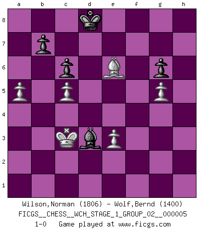 Last move : 1-0 2008 October 11 10:58:6 [Event "FICGS__CHESS__WCH_STAGE_1_GROUP_02__000005"] [Site "FICGS"] [Date "2008.07.08"] [Round "1"] [White "Wilson,Norman"] [Black "Wolf,Bernd"] [Result "1-0"] [WhiteElo "1806"] [BlackElo "1400"] 1.d4 f5 2.g3 Nf6 3.Bg2 g6 4.Nf3 Bg7 5.b3 O-O 6.c4 d6 7.Bb2 Ne4 8.O-O Nd7 9.Nc3 Ndf6 10.Nxe4 Nxe4 11.Nd2 Nf6 12.Qc2 c6 13.Rfd1 Qc7 14.a4 a5 15.e3 Be6 16.Re1 Rad8 17.e4 fxe4 18.Nxe4 Bf5 19.Nxf6+ Bxf6 20.Qd2 e5 21.Bc3 exd4 22.Bxd4 Bxd4 23.Qxd4 Rde8 24.g4 Bc8 25.h3 Qg7 26.Qd2 Qc7 27.Re3 Rxe3 28.Qxe3 Qf7 29.Re1 Qf4 30.Qxf4 Rxf4 31.Rd1 Rf6 32.g5 Rf7 33.h4 Bf5 34.Rxd6 Bc2 35.Bh3 Kf8 36.Be6 Rf4 37.c5 Rxh4 38.Rd7 Rb4 39.Rf7+ Ke8 40.Rf3 Re4 41.Re3 Rxe3 42.fxe3 Bf5 43.Bc4 Be4 44.Kf2 Kd7 45.Ke2 Ke7 46.Kd2 Bf5 47.Kc3 Be6 48.Kd4 Bg4 49.Kc3 Be6 50.Be2 Kd7 51.b4 axb4+ 52.Kxb4 Bf5 53.Ka5 Kc7 54.Bc4 Bc2 55.Bg8 Bf5 56.Bxh7 Bd3 57.Bg8 Be4 58.Be6 Bc2 59.Kb4 Kd8 60.Ka5 Kc7 61.Kb4 Kd8 62.a5 Bd3 63.Kc3 1-0 Dutch defense Kingside Castling by player Black (move 5) Kingside Castling by player White (move 8) Player White won this chess game. Follow this game move after move (download)Botvinnik tried to take the mystery out of Chess, always relating it to situations in ordinary life. He used to call Chess a typical inexact problem similar to those which people are always having to solve in everyday life. (Garry Kasparov) Drei Punkte vor allen anderen ist wie einer, der im weißen Anzug posiert, während der Rest in Müllsäcke gekleidet dasteht. (Viktor Kortschnoi) Ayuda a tus piezas para que ellas te puedan ayudar. (Paul Morphy) Les échecs sont un jeu par leur forme, un art par leur essence et une science par sa difficulté d'acquisition. Ils peuvent vous procurer autant de plaisir qu'un bon livre ou une belle musique, mais vous n'aurez une réelle joie que si vous arrivez à bien jouer. (Tigran Petrosian) Wisdom is the reward you get for a lifetime of listening when you'd have preferred to talk. (Doug Larson)