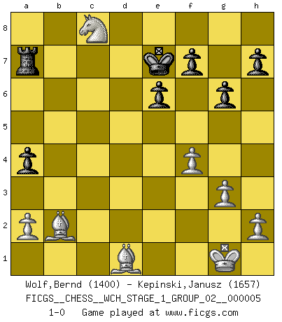 Last move : 1-0 2008 September 5 13:20:2 [Event "FICGS__CHESS__WCH_STAGE_1_GROUP_02__000005"] [Site "FICGS"] [Date "2008.07.08"] [Round "1"] [White "Wolf,Bernd"] [Black "Kepinski,Janusz"] [Result "1-0"] [WhiteElo "1400"] [BlackElo "1657"] 1.f4 b6 2.Nf3 Nf6 3.g3 Bb7 4.Bg2 e6 5.O-O d5 6.b3 d4 7.c3 d3 8.exd3 Qxd3 9.b4 Be4 10.Re1 Nbd7 11.Rxe4 Nxe4 12.Ne1 Qd5 13.d3 Nxc3 14.Bxd5 Nxd1 15.Bxa8 Bxb4 16.Nc2 Bc3 17.Bc6 Bxa1 18.Nxa1 Ke7 19.Bf3 Nc5 20.d4 Nd3 21.Ba3+ Kf6 22.Bxd1 a5 23.Nc2 c5 24.dxc5 Nxc5 25.Ne3 Rd8 26.Be2 g6 27.Bb2+ Ke7 28.Nc4 Ne4 29.Nxb6 Rb8 30.Nc4 Nd6 31.Nbd2 Nxc4 32.Nxc4 a4 33.Bd1 Ra8 34.Nb6 Ra7 35.Nc8+ 1-0 Bird's Opening Kingside Castling by player White (move 5) Player White won this chess game. Follow this game move after move (download)It's always better to sacrifice your opponent's men. (Savielly Tartakover) Mutter, ich bin eben Ex-Weltmeister geworden. --beim nach Hause Kommen nach dem Verlust des WM-Titels an Mihail Botvinnik -- (Mikhail Nekhemyevich Tal) Los Peones son el alma de una partida de Ajedrez. (Francois Andre Danican Philidor) Je ne crois pas en la psychologie, je crois aux bons coups. (Robert Fischer) I just play for fun. (Anna Kournikova)