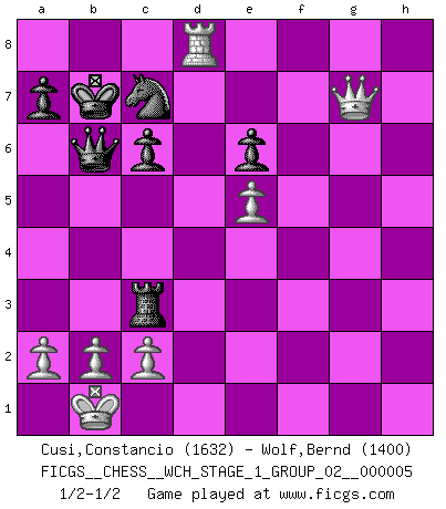 Last move : 1/2-1/2 2008 September 20 0:28:5 [Event "FICGS__CHESS__WCH_STAGE_1_GROUP_02__000005"] [Site "FICGS"] [Date "2008.07.08"] [Round "1"] [White "Cusi,Constancio"] [Black "Wolf,Bernd"] [Result "1/2-1/2"] [WhiteElo "1632"] [BlackElo "1400"] 1.e4 d5 2.e5 Bf5 3.d4 e6 4.Be3 Nd7 5.g4 Bg6 6.Nc3 h5 7.gxh5 Bxh5 8.Be2 Bxe2 9.Ngxe2 c5 10.Qd3 Ne7 11.O-O-O Nc6 12.f4 Rh3 13.Qd2 Qa5 14.dxc5 Bxc5 15.Bxc5 Nxc5 16.f5 O-O-O 17.Qf4 g6 18.fxe6 fxe6 19.Rhg1 g5 20.Qxg5 Rxh2 21.Kb1 Qb4 22.Rg4 Qb6 23.Qf4 Rh3 24.R4g1 d4 25.Nxd4 Rxc3 26.Nxc6 Rxd1+ 27.Rxd1 bxc6 28.Qf8+ Kb7 29.Rd8 Na6 30.Qg7+ Nc7 1/2-1/2 Scandinavian (centre counter) defense Queenside Castling by player White (move 11) Queenside Castling by player Black (move 16) This chess game ended in a draw. Follow this game move after move (download)The game of chess is the touchstone of the intellect. (Goethe) Ich verlor meine Bürgerrechte, mein Gehalt wurde mir nicht mehr bezahlt und ich wurde zensiert und durfte nicht mehr ins Ausland reisen. [nach dem Match Fischer-Taimanov 6:0] (Mark Taimanov) El jugador blanco perdió porque fallo en recordar la coreccta continuación y tuvo que pensar por sí mismo las movidas. (Siegbert Tarrasch) Le jeu d'échecs fait naître et fortifie en nous plusieurs qualités précieuses dans le cours de l'existence, telles que la prévoyance, la circonspection, la prudence, et la persévérance. (Benjamin Franklin - 1783, la morale des échecs) Life is the sum of all your choices. (Albert Camus)