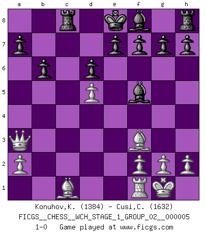 Last move : 1-0 2008 August 28 2:47:9 [Event "FICGS__CHESS__WCH_STAGE_1_GROUP_02__000005"] [Site "FICGS"] [Date "2008.07.08"] [Round "1"] [White "Konuhov,Konstantin"] [Black "Cusi,Constancio"] [Result "1-0"] [WhiteElo "1384"] [BlackElo "1632"] 1.e4 c5 2.Nf3 d6 3.c3 Nf6 4.Be2 Nc6 5.d4 cxd4 6.cxd4 Nxe4 7.d5 Qa5+ 8.Nc3 Nxc3 9.bxc3 Ne5 10.O-O Nxf3+ 11.Bxf3 Qxc3 12.Rb1 b6 13.Rb3 Qa1 14.Qc2 Bd7 15.Rc3 Bf5 16.Qb3 Qxc3 17.Qxc3 Rc8 18.Qa3 1-0 Sicilian Kingside Castling by player White (move 10) Player White won this chess game. Follow this game move after move (download)I look one move ahead... the best ! (Siegbert Tarrasch) Ich glaube nicht an Psychologie, ich glaube an gute Züge. (Robert James Fischer) Los tropiezos estan todos ahí en el tablero, esperando que se cometan. (Savielly Tartakover) J'ai vu le vaincu d'Echecs jouer des années durant dans l'espoir de la fête de la victoire. Car tu es plus riche de ce qu'elle existe si même elle n'est point pour toi. Ainsi de la perle du fond des mers. (Antoine de Saint-Exupéry) If I had no sense of humor, I would long ago have committed suicide. (Mahatma Gandhi)