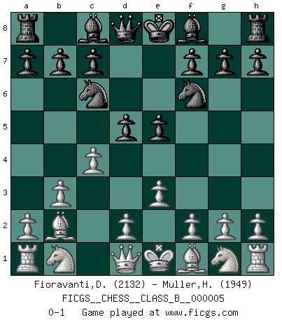 Last move : 0-1 2006 August 15 19:20:10 [Event "FICGS__CHESS__CLASS_B__000005"] [Site "FICGS"] [Date "2006.07.24"] [Round "1"] [White "Fioravanti,Diego"] [Black "Muller,Henri-Louis"] [Result "0-1"] [WhiteElo "2132"] [BlackElo "1949"] 1.b3 e5 2.Bb2 Nc6 3.e3 Nf6 4.c4 d5 0-1 Nimzovich-Larsen attack : Modern variation Player Black won this chess game. Follow this game move after move (download)Suddenly it was obvious to me in my analysis I had missed what Fischer had found with the greatest of ease at the board. (Mikhail Botvinnik) Kombinieren und Schwarzhandel gehören verboten. (Savielly Grigorievitsch Tartakower) El tablero es el mundo, las piezas es el fenomeno del universo, las reglas del juego son lo que llamamos leyes de la naturaleza y el jugador del lado opuesto, se encuentra oculto a nuestra vista. (Thomas Huxley) La tactique est l'élément le plus important du milieu de jeu. (Siegbert Tarrasch) Ah, beer! The cause of, and the solution to, all of life's problems. (Homer Simpson)
