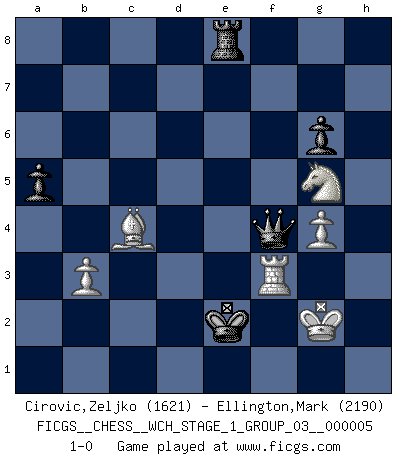 Last move : 1-0 2008 October 7 22:56:57 [Event "FICGS__CHESS__WCH_STAGE_1_GROUP_03__000005"] [Site "FICGS"] [Date "2008.07.08"] [Round "1"] [White "Cirovic,Zeljko"] [Black "Ellington,Mark"] [Result "1-0"] [WhiteElo "1621"] [BlackElo "2190"] 1.e4 e6 2.d4 d5 3.exd5 exd5 4.Nf3 Bd6 5.c4 c6 6.Nc3 Bg4 7.cxd5 cxd5 8.Bb5+ Nc6 9.O-O Nge7 10.Bg5 O-O 11.Nxd5 Bxh2+ 12.Nxh2 Bxd1 13.Bxc6 f6 14.Nxe7+ Qxe7 15.Bd5+ Kh8 16.Bxf6 Qxf6 17.Raxd1 Rad8 18.Bxb7 Rxd4 19.Rxd4 Qxd4 20.b3 Qb2 21.Bd5 Qxa2 22.Nf3 a5 23.Rd1 Rd8 24.Ne5 Rb8 25.g4 g6 26.Bc4 Re8 27.f4 Qc2 28.Rd7 Qc1+ 29.Kg2 Qxf4 30.Nf7+ Kg7 31.Ng5 Kf6 32.Nxh7+ Ke5 33.Rd5+ Ke4 34.Ng5+ Ke3 35.Rd3+ Ke2 36.Rf3 1-0 This chess game has been lost on time (started : 2008.07.08 16:15:57) French : Exchange variation Kingside Castling by player White (move 9) Kingside Castling by player Black (move 10) Player White won this chess game. Follow this game move after move (download)Fischer prefers to enter Chess history alone. (Miguel Najdorf) Wenn es im Universum noch irgendwo intelligente Lebewesen gibt, dann kennen sie Go. (Emanuel Lasker) Uno por uno, yo los acribillé, mi superioridad muy pronto se volvio aparente. (Jose Capablanca) Une platitude souvent récitée à propos des Echecs est qu'une des choses les plus difficiles à réaliser est de gagner une position gagnante. Cela ne manque pas de sens mais, pour ma part, j'ai toujours trouvé plus difficile de gagner une position perdante. (Tim Krabbe) The only thing that overcomes hard luck is hard work. (Harry Golden)