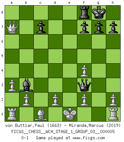 Last move : 0-1 2008 September 7 9:36:2 [Event "FICGS__CHESS__WCH_STAGE_1_GROUP_03__000005"] [Site "FICGS"] [Date "2008.07.08"] [Round "1"] [White "von Buttlar,Paul"] [Black "Miranda,Marcus"] [Result "0-1"] [WhiteElo "1663"] [BlackElo "2019"] 1.c4 e5 2.Nc3 Nf6 3.Nf3 Nc6 4.e3 Bb4 5.Qc2 Bxc3 6.Qxc3 Qe7 7.a3 d5 8.cxd5 Nxd5 9.Qc2 e4 10.Bb5 exf3 11.Bxc6+ bxc6 12.Qxc6+ Qd7 13.Qxa8 O-O 14.gxf3 Ba6 15.Qxa7 Qb5 16.Kd1 Qe2+ 17.Kc2 Bd3+ 18.Kb3 Bc4+ 19.Kc2 Qd3+ 20.Kd1 Bb3+ 21.Ke1 Nf4 22.exf4 Qxf3 0-1 English Opening Kingside Castling by player Black (move 13) Player Black won this chess game. Follow this game move after move (download)A big shock; the best chess player in history has passed away. (Lajos Portisch, about Bobby Fischer's death) Karpov ist ein Museumsstück. (Garry Kasparov) Una compensación adecuada por un sacrificio es tener una combinación sólida que conduce a una posición ganadora; una compensación adecuada por una metida de pata es dejar a tu oponente arrebatar una derrota de las fauces de la victoria. (Bruce A. Moon) Les échecs, c'est l'art d'analyser. (Mikhail Botvinnik) Chess, like love, like music, has the power to make people happy. (Siegbert Tarrasch)