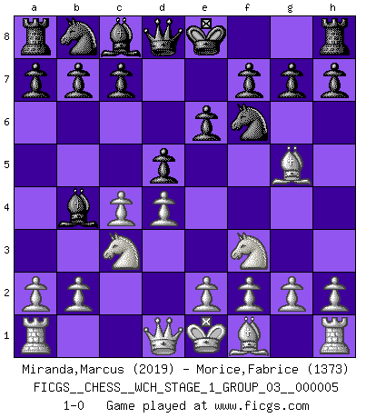 Last move : 1-0 2008 August 13 5:57:38 [Event "FICGS__CHESS__WCH_STAGE_1_GROUP_03__000005"] [Site "FICGS"] [Date "2008.07.08"] [Round "1"] [White "Miranda,Marcus"] [Black "Morice,Fabrice"] [Result "1-0"] [WhiteElo "2019"] [BlackElo "1373"] 1.d4 Nf6 2.c4 e6 3.Nf3 d5 4.Nc3 Bb4 5.Bg5 1-0 This chess game has been lost on time (started : 2008.07.08 16:15:57) Queen's pawn game Player White won this chess game. Follow this game move after move (download)You may learn much more from a game you lose than from a game you win. You will have to lose hundreds of games before becoming a good player. (Jose Raul Capablanca) Mit Schach schule ich mein Gefühl für Geometrie, was für Tennis und Schach gleichermaßen wichtig ist. (Boris Becker) En posiciones complicadas, Bobby Fischer pocas veces tuvo que temer de cualquiera. (Paul Keres) Toutes choses étant égales, c'est la conviction qui gagne. Alliée à une volonté de vaincre, elle sert de détonateur, suscite des idées, disperse les doutes et aide à penser clairement. (Robert Fischer) I think your argument is specious - I think your tie is ugly. (Gregory House to Dr. Foreman, House M.D.)