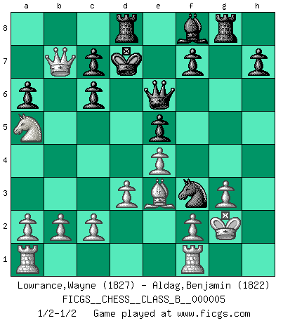 Last move : 1/2-1/2 2006 August 26 16:45:57 [Event "FICGS__CHESS__CLASS_B__000005"] [Site "FICGS"] [Date "2006.07.24"] [Round "1"] [White "Lowrance,Wayne"] [Black "Aldag,Benjamin"] [Result "1/2-1/2"] [WhiteElo "1827"] [BlackElo "1822"] 1.e4 e5 2.Nf3 Nc6 3.Bb5 a6 4.Bxc6 dxc6 5.O-O Bg4 6.h3 Bxf3 7.Qxf3 Qf6 8.Qb3 O-O-O 9.d3 Ne7 10.Be3 g5 11.Nd2 Ng6 12.Nc4 Nf4 13.Rfe1 Rg8 14.Na5 b6 15.Bxb6 g4 16.Be3 gxh3 17.Qb7+ Kd7 18.g3 Ng2 19.Rf1 Nh4 20.Kh2 Nf3+ 21.Kxh3 Qe6+ 22.Kg2 Nh4+ 23.Kh2 Nf3+ 24.Kg2 Nh4+ 25.Kh2 Nf3+ 26.Kg2 1/2-1/2 Ruy Lopez : Exchange variation, 5.O-O Kingside Castling by player White (move 5) Queenside Castling by player Black (move 8) This chess game ended in a draw. Follow this game move after move (download)The passion for playing Chess is one of the most unaccountable in the world. (H.G. Wells) Bis zum Jahr 1971 verlief in meiner Schachkariere alles glatt. Dieses dramatische Match [Fischer-Taimanov 6:0] machte mein Leben zur Hölle. (Mark Taimanov) Solo los afeminados hacen el Enroque. (Rob Sillars) Ne tendez aucun piège pour le plaisir ! Ne jouez rien dans l'espoir que l'adversaire réagisse de façon stupide ! Prenez toujours pour acquis que l'adversaire va trouver le meilleur coup ! Ne jouez jamais de coup dans l'espoir que l'adversaire ne voie pas la menace ! Chacun de vos coups doit améliorer la position d'une façon ou d'une autre. Quotation,n.: The act of repeating erroneously the words of another. The words erroneously repeated. (Ambrose Bierce, The Devil's Dictionary)