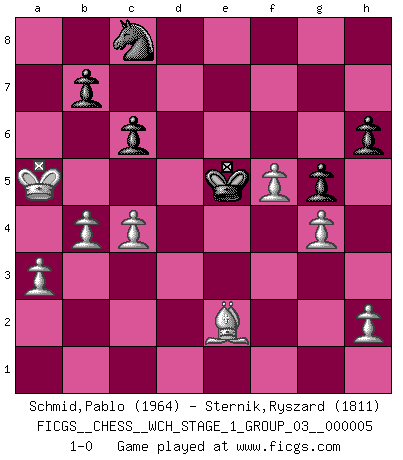 Last move : 1-0 2008 August 29 22:16:36 [Event "FICGS__CHESS__WCH_STAGE_1_GROUP_03__000005"] [Site "FICGS"] [Date "2008.07.08"] [Round "1"] [White "Schmid,Pablo"] [Black "Sternik,Ryszard"] [Result "1-0"] [WhiteElo "1964"] [BlackElo "1811"] 1.d4 Nf6 2.f3 d5 3.e4 dxe4 4.Nc3 e3 5.Bxe3 e6 6.Bd3 Bd6 7.Nge2 O-O 8.Qd2 Nc6 9.a3 Nd5 10.Nxd5 exd5 11.Bf4 Qh4+ 12.g3 Bxf4 13.Nxf4 Re8+ 14.Kf2 Qf6 15.c3 Be6 16.Qc2 h6 17.Rhe1 a6 18.Re2 Re7 19.Rae1 Rae8 20.Qb3 Nd8 21.Nxd5 Bxd5 22.Qxd5 Rxe2+ 23.Rxe2 Rxe2+ 24.Bxe2 c6 25.Qe5 Qxe5 26.dxe5 Kf8 27.f4 Ke7 28.f5 g6 29.g4 g5 30.Ke3 a5 31.Kd4 f6 32.exf6+ Kxf6 33.Kc5 Nf7 34.Kb6 Nd6 35.Kxa5 Nc8 36.b4 Ke5 37.c4 1-0 Blackmar-Diemer gambit Kingside Castling by player Black (move 7) Player White won this chess game. Follow this game move after move (download)Winning isn't everything... but losing is nothing. (Mednis) Besser ein falscher Plan, logisch durchgeführt, als gar kein Plan. (Viktor Kortschnoi) Es muy difícil jugar en contra de la teoría de Einstein. - en su primera derrota en contra de Fischer (Mikhail Tal) Mais l'homme est une créature légère et illogique : semblable au joueur d'échecs, il n'aime que le processus du but à atteindre, non le but lui-même. (Dostoïevsky) The ego is not master in its own house. (Sigmund Freud)
