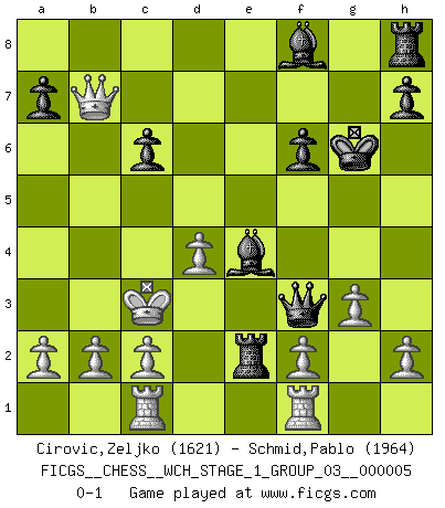 Last move : 0-1 2008 July 25 13:57:2 [Event "FICGS__CHESS__WCH_STAGE_1_GROUP_03__000005"] [Site "FICGS"] [Date "2008.07.08"] [Round "1"] [White "Cirovic,Zeljko"] [Black "Schmid,Pablo"] [Result "0-1"] [WhiteElo "1621"] [BlackElo "1964"] 1.e4 e5 2.Nf3 Nc6 3.Bb5 f5 4.d4 fxe4 5.Bxc6 dxc6 6.Nxe5 Qh4 7.g3 Qh3 8.Qe2 Qg2 9.Rf1 Bh3 10.Nd2 Nf6 11.Nef3 Bg4 12.Nxe4 Bxf3 13.Nxf6+ Kf7 14.Qe5 gxf6 15.Qxc7+ Kg6 16.Qxb7 Re8+ 17.Be3 Rxe3+ 18.Kd2 Re2+ 19.Kc3 Be4 20.Rac1 Qf3+ 0-1 Comment by player 1 : Zeljko Cirovic : experimental chess Comment by player 2 : Pablo Schmid : Indeed, 7.g3 seems to be a novelty ;) Ruy Lopez : Schliemann defense Player Black won this chess game. Follow this game move after move (download)What is the difference between chess and football? Everybody understands football, but nobody plays it. Everybody plays chess, but nobody understands it. Everything is relative. (Vladimir Kramnik) Um sich vor der Gefahr einer Erkältung zu schützen, sorge der wanderlustige König beizeiten für ein brauchbares Versteck. (Aaron Nimzowitsch) Cuando me preguntan: -¿Cual es el secreto que te hace hacer mejores movidas que tus oponentes?, Yo respondo: Me da gusto que me pregunten eso, porque, como veran, hay una simple razón. Yo pienso mis propias movidas y dejo a mi oponente que el piense las suyas. (Alexander Alekhine) J'ai vu le vaincu d'Echecs jouer des années durant dans l'espoir de la fête de la victoire. Car tu es plus riche de ce qu'elle existe si même elle n'est point pour toi. Ainsi de la perle du fond des mers. (Antoine de Saint-Exupéry) Those parts of the system that you can hit with a hammer (not advised) are called hardware; those program instructions that you can only curse at are called software. (Anonymous)