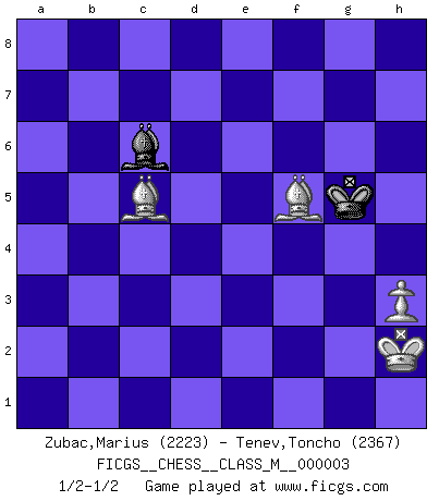 Last move : 1/2-1/2 2006 December 4 17:25:52 [Event "FICGS__CHESS__CLASS_M__000003"] [Site "FICGS"] [Date "2006.04.15"] [Round "1"] [White "Zubac,Marius"] [Black "Tenev,Toncho"] [Result "1/2-1/2"] [WhiteElo "2223"] [BlackElo "2367"] 1.d4 Nf6 2.c4 e6 3.Nc3 Bb4 4.f3 O-O 5.a3 Bxc3+ 6.bxc3 Ne8 7.e4 b6 8.Bd3 Ba6 9.Nh3 Qh4+ 10.Nf2 c5 11.O-O d6 12.f4 Nc6 13.Be3 Rc8 14.Nh3 h6 15.Rc1 Na5 16.Qe2 Nf6 17.Nf2 Qh5 18.g4 Qh4 19.e5 Ne8 20.Rc2 Bb7 21.Rb2 Rc7 22.Bd2 Rd7 23.R2b1 h5 24.Be1 dxe5 25.fxe5 Qe7 26.Rd1 f5 27.exf6 Qxf6 28.gxh5 cxd4 29.Ng4 Qxf1+ 30.Qxf1 Rxf1+ 31.Bxf1 Nb3 32.Ne5 Rd6 33.cxd4 Nxd4 34.Rd2 Nf3+ 35.Nxf3 Bxf3 36.Rxd6 Nxd6 37.Bg3 Nc8 38.Bg2 Be2 39.Bb7 Ne7 40.Bb8 Bxc4 41.Bxa7 b5 42.Ba6 Nd5 43.Bb8 Nb6 44.Kf2 Kh7 45.Bc7 Na4 46.Ke3 Kh6 47.Be5 Nc5 48.Bc8 Nd3 49.Bc3 Kxh5 50.Bxg7 b4 51.Kd4 Kg6 52.Bh8 Kh7 53.Bf6 Kg6 54.Be7 bxa3 55.Bxa3 Bb5 56.Bxe6 Ne1 57.Ke4 Bc6+ 58.Kf4 Nd3+ 59.Kg3 Ne5 60.Bb3 Nf3 61.h3 Nd4 62.Bd1 Bd7 63.Bc5 Nf5+ 64.Kh2 Bc6 65.Bc2 Kg5 66.Bxf5 1/2-1/2 Nimzo-Indian : Kmoch variation Kingside Castling by player Black (move 4) Kingside Castling by player White (move 11) 10 pieces endgame at move 50 : White KBBPP , Black KBNPP WHITE : King + 2 Bishops 2 Pawns BLACK : King + 1 Bishop 1 Knight 2 Pawns 9 pieces endgame at move 54 : White KBBP , Black KBNPP WHITE : King + 2 Bishops 1 Pawn BLACK : King + 1 Bishop 1 Knight 2 Pawns 8 pieces endgame at move 55 : White KBBP , Black KBNP WHITE : King + 2 Bishops 1 Pawn BLACK : King + 1 Bishop 1 Knight 1 Pawn 7 pieces endgame at move 56 : White KBBP , Black KBN WHITE : King + 2 Bishops 1 Pawn BLACK : King + 1 Bishop 1 Knight 6 pieces endgame at move 66 : White KBBP , Black KB WHITE : King + 2 Bishops 1 Pawn BLACK : King + 1 Bishop This chess game ended in a draw. Follow this game move after move (download)Modern Chess is too much concerned with things like Pawn structure. Forget it, Checkmate ends the game. (Nigel Short) Man gibt nur Pakete auf. (Paul Keres) Aquellos que dicen entender al Ajedrez, no entienden nada. (Robert Hubner) Ce qui caractérise les parties de combat, c'est que si le défenseur a constamment de difficiles problèmes à résoudre, l'attaquant doit chercher sans relâche de nouvelles possibilités d'attaque. (Koblentz) It's not enough to succeed. Others must fail. (Gore Vidal)