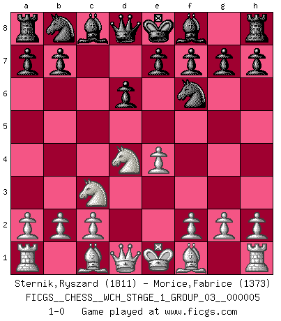 Last move : 1-0 2008 August 12 17:48:9 [Event "FICGS__CHESS__WCH_STAGE_1_GROUP_03__000005"] [Site "FICGS"] [Date "2008.07.08"] [Round "1"] [White "Sternik,Ryszard"] [Black "Morice,Fabrice"] [Result "1-0"] [WhiteElo "1811"] [BlackElo "1373"] 1.e4 c5 2.Nf3 d6 3.d4 cxd4 4.Nxd4 Nf6 5.Nc3 1-0 This chess game has been lost on time (started : 2008.07.08 16:15:57) Sicilian Player White won this chess game. Follow this game move after move (download)Chess is a foolish expedient for making idle people believe they are doing something very clever when they are only wasting their time. (George Bernard Shaw) Es gibt zwei Arten von Opfern: Korrekte und meine. (Mikhail Nekhemyevich Tal) Con el fin de mejorar tu juego, debes de estudiar los finales antes que todo, ya que mientras que los finales pueden ser estudiados y dominados por sí mismos, el juegomedio y la apertura deben de ser estudiados en relación con los finales. (José Raúl Capablanca) Assurément je connaissais par expérience le mystérieux attrait de ce jeu royal, le seul entre tous les jeux inventés par les hommes qui échappe souverainement à la tyrannie du hasard, le seul où l'on ne doive sa victoire qu'à son intelligence ou plutôt à une certaine forme d'intelligence. Mais n'est-ce pas déjà le limiter injurieusement que d'appeler les échecs un jeu ? N'est-ce pas une science, un art ou quelque chose qui, comme le cercueil de Mahomet entre ciel et terre, est suspendu entre l'un et l'autre, et qui réunit un nombre incroyable de contraires ? [...] C'est une pensée qui ne mène à rien, une mathématique qui n'établit rien, un art qui ne laisse pas d'uvre, une architecture sans matière; et il l'a prouvé néanmoins qu'il était plus durable, à sa manière, que les livres ou que tout autre monument, ce jeu unique qui appartient à tous les peuples et à tous les temps, et dont personne ne sait quel dieu en fit don à la terre pour tuer l'ennui, pour aiguiser l'esprit et stimuler l'âme. Où commence-t-il, où finit-il ? (Stefan Zweig) This is where the fun begins. (Anakin Skywalker in Star Wars ep.3)