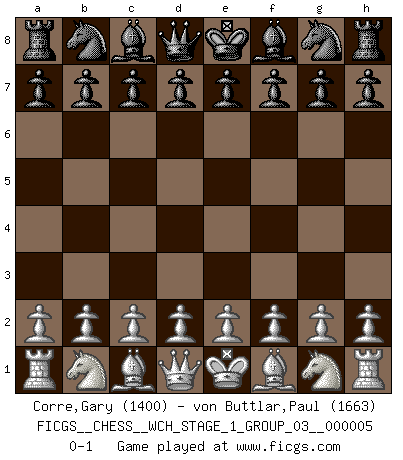 Last move : 0-1 2008 August 7 17:16:17 [Event "FICGS__CHESS__WCH_STAGE_1_GROUP_03__000005"] [Site "FICGS"] [Date "2008.07.08"] [Round "1"] [White "Corre,Gary"] [Black "von Buttlar,Paul"] [Result "0-1"] [WhiteElo "1400"] [BlackElo "1663"] 0-1 This chess game has been lost on time (started : 2008.07.08 16:15:57) Player Black won this chess game. Follow this game move after move (download)The mistakes are there, waiting to be made. (Savielly Tartakower) Wer der Ansicht ist, daß alle Schachspieler verrückt sind, wird durch Studium des Lebens von Emil Josef Diemer nicht auf andere Gedanken kommen. (Hans Ree) La mitad de las variaciones que son calculadas en una partida de torneo, resultan ser completamente superfluas. Desafortunadamente, nadie sabe por adelantado cual mitad. (Jan Tinman) Les échecs, c'est l'art d'analyser. (Mikhail Botvinnik) Memory is a crazy woman that hoards colored rags and throws away food. (Austin O'Malley)