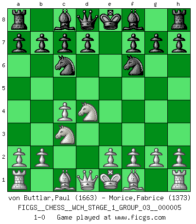 Last move : 1-0 2008 August 18 18:27:12 [Event "FICGS__CHESS__WCH_STAGE_1_GROUP_03__000005"] [Site "FICGS"] [Date "2008.07.08"] [Round "1"] [White "von Buttlar,Paul"] [Black "Morice,Fabrice"] [Result "1-0"] [WhiteElo "1663"] [BlackElo "1373"] 1.c4 e5 2.Nc3 Nf6 3.Nf3 Nc6 4.d4 exd4 5.Nxd4 1-0 This chess game has been lost on time (started : 2008.07.08 16:15:57) English Opening Player White won this chess game. Follow this game move after move (download)Man is a frivolous, a specious creature, and like a Chess player, cares more for the process of attaining his goal than for the goal itself. (Dostoyevsky) Wenn du auf das Glück wartest, wird das Leben ziemlich langweilig. (Mikhail Nekhemyevich Tal) El Ajedrez es un juego de pelea el cual es puramente intelectual e incluye la suerte. (Richard Reti) À la honte des hommes, on sait que les lois du jeu sont les seules qui soient partout justes, claires, inviolables et exécutées. Pourquoi l'Indien qui a donné les règles du jeu d'échecs est-il obéi de bon gré dans toute la terre, et que les décrétales des papes, par exemple, sont aujourd'hui un objet d'horreur et de mépris ? C'est que l'inventeur des échecs combina tout avec justesse pour la satisfaction des joueurs, et que les papes, dans leurs décrétales, n'eurent en vue que leur seul avantage. L'Indien voulut exercer également l'esprit des hommes et leur donner du plaisir; les papes ont voulu abrutir l'esprit des hommes. Voltaire (Dictionnaire philosophique / Garnier 1967) If we don't succeed, we run the risk of failure. (George W. Bush)