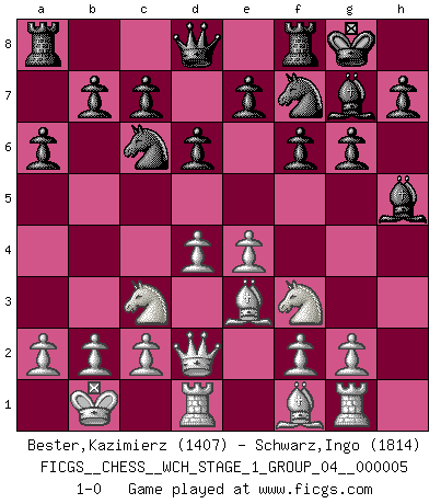 Last move : 1-0 2008 August 25 7:12:35 [Event "FICGS__CHESS__WCH_STAGE_1_GROUP_04__000005"] [Site "FICGS"] [Date "2008.07.08"] [Round "1"] [White "Bester,Kazimierz"] [Black "Schwarz,Ingo"] [Result "1-0"] [WhiteElo "1407"] [BlackElo "1814"] 1.e4 g6 2.Nf3 Bg7 3.Nc3 f6 4.d3 Nh6 5.Be3 Nf7 6.Qd2 d6 7.O-O-O Nc6 8.Kb1 O-O 9.d4 a6 10.h4 Bg4 11.h5 Bxh5 12.Rg1 1-0 Robatsch (Modern) defense Queenside Castling by player White (move 7) Kingside Castling by player Black (move 8) Player White won this chess game. Follow this game move after move (download)Chess is a fairy tale of 1001 blunders. (Savielly Tartakower) Wenn Du einsam bist, wenn Du Dich in der Welt wie ein Fremder fühlst, spiele Schach. Das wird Deinen Geist erheben und Dein Ratgeber im Kampf sein. (Aristoteles) Diferente gente reacciona diferentemente en aceptar la derrota. (Bobby Fischer) Les erreurs sont comme les malheurs, elles n'arrivent jamais seules. (Siegbert Tarrasch) I know the human being and fish can coexist peacefully. (George W. Bush, Saginaw sept. 29, 2000)