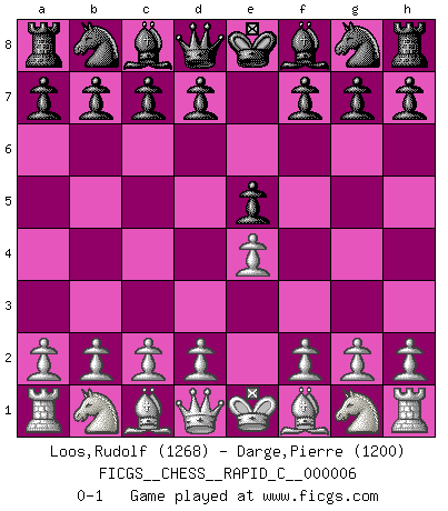 Last move : 0-1 2006 August 31 19:3:29 [Event "FICGS__CHESS__RAPID_C__000006"] [Site "FICGS"] [Date "2006.07.24"] [Round "1"] [White "Loos,Rudolf"] [Black "Darge,Pierre"] [Result "0-1"] [WhiteElo "1268"] [BlackElo "1200"] 1.e4 e5 0-1 This chess game has been lost on time (started : 2006.07.24 21:10:38) King's pawn game Player Black won this chess game. Follow this game move after move (download)Do you realize Fischer almost never has any bad pieces? He exchanges them, and the bad pieces remain with his opponents. (Yuri Balashov) Die Elozahlen sind sehr schlecht für das Schach. Jetzt ist Schach eine Sportindustrie, die darauf zielt Elopunkte zu machen. (Miguel Najdorf) Yo tuve un dolor de muelas en la primer partida. En el segundo juego, tuve un dolor de cabeza. En el tercero, tuve un ataque de reumatísmo. En la cuarta partida, no me sentía muy bien. ¿Y en el quinto juego? Bueno, ¿que acaso uno tiene que ganar todos los juegos?. (Siegbert Tarrasch) On n'a jamais que l'âge auquel on a commence à jouer aux échecs car après on cesse de vieillir. (Capablanca) May the force be with you. (Han Solo in Star Wars ep.4)